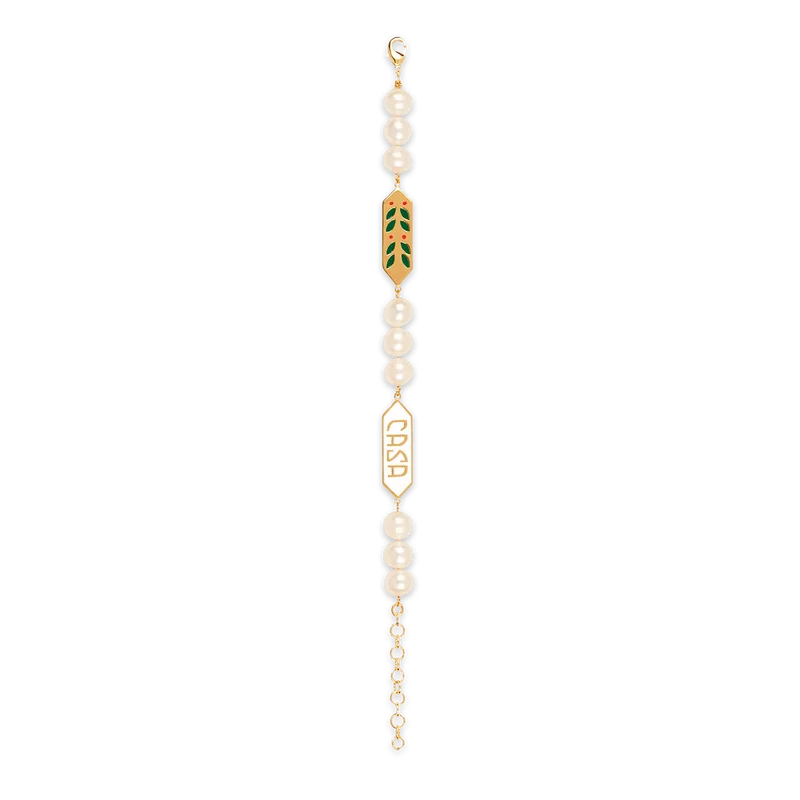 Das Laurel Pearl Armband zeigt das charakteristische Lorbeerblatt-Motiv und das Diamant-Logo des Hauses. Es besteht aus Süßwasserperlen, Messing und handbemaltem Emaille. Abgerundet wird es durch eine vergoldete Kette und einen Karabinerverschluss – dieses Stück wird mit einer Geschenkbox, einem Staubbeutel mit Markenlogo und einer Produktbroschüre geliefert.