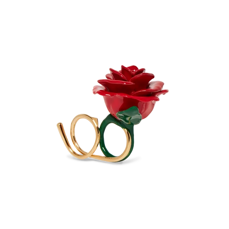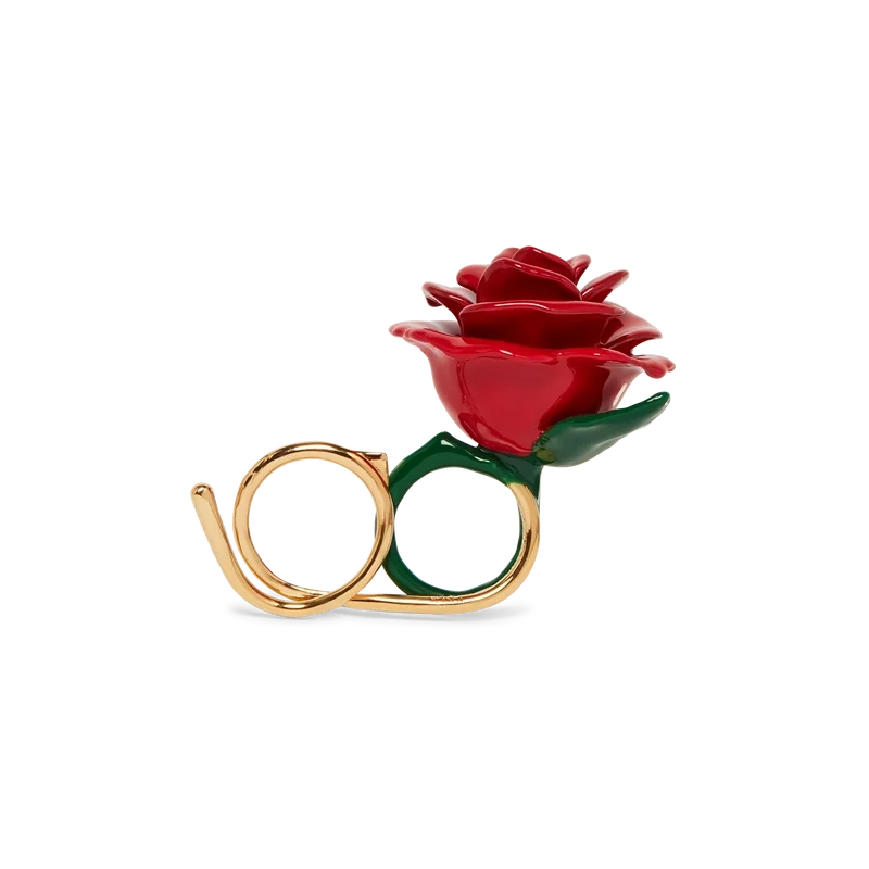 Der Rose Double Ring ist von den Subkulturen-Tattoos von La inspiriert und besteht aus handbemaltem Emaille und vergoldetem Messing. Die Rose verläuft in ein Glied über und windet sich um Ihre Finger, um einen doppelten Fingerring zu bilden.