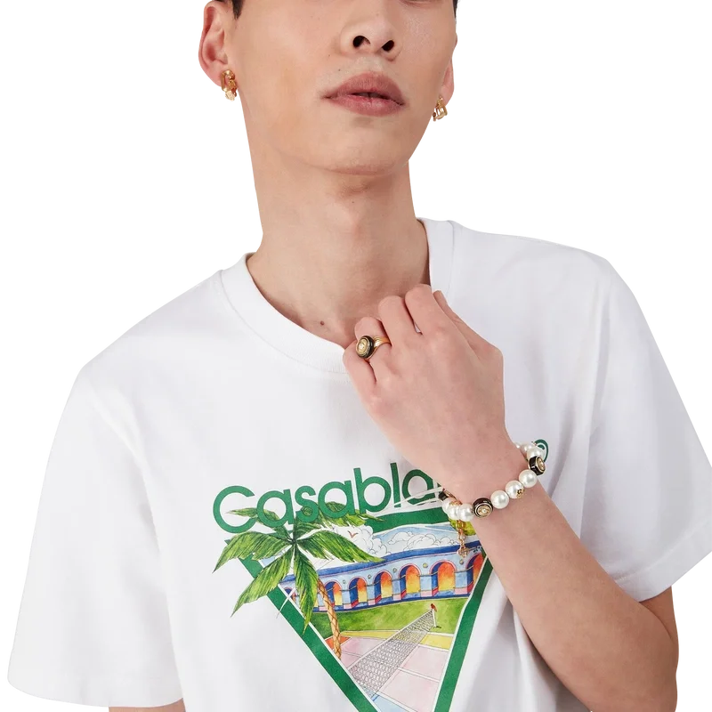 Das Spoke Wheel Armband ist aus vergoldetem Messing, Emaille und Süßwasserperlen gefertigt. Abgerundet wird es durch das ineinander verschlungene CC-Logo des Hauses, eine vergoldete Kette und einen Karabinerverschluss.