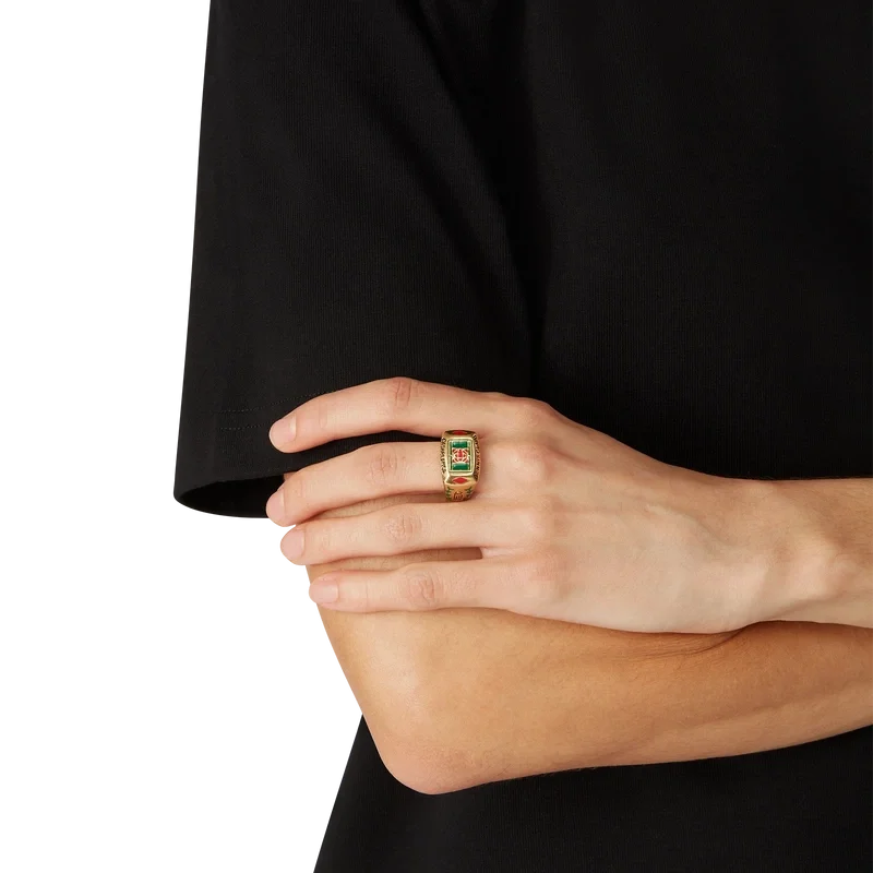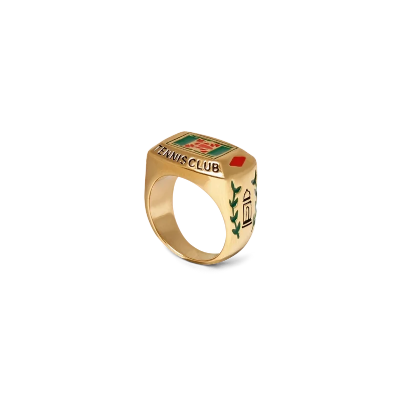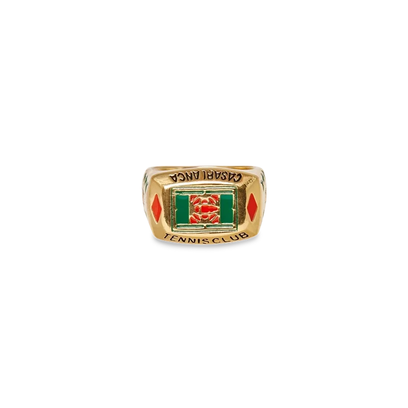 Der Tennis Club Ring ist ein Stück aus unserer Kernkollektion, das auf der Identität des Hauses basiert und aus vergoldetem Messing und handbemaltem Emaille gefertigt ist. Mit Blattwerk-Details und dem Casablanca Tennis Club-Logo veredelt – dieses Stück wird mit einer Geschenkbox, einem Staubbeutel mit Markenlogo und einer Produktbroschüre geliefert.