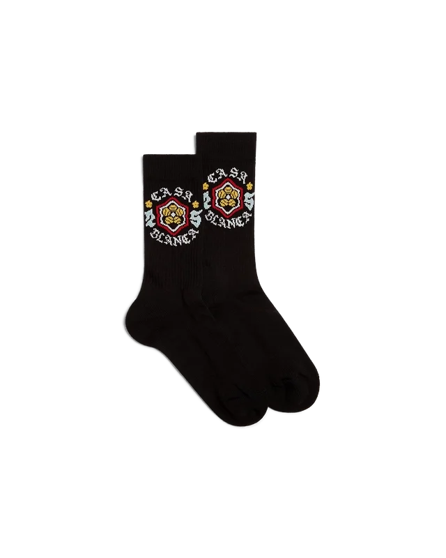 Die Emblem-Socken sind ein Sportdesign aus einem Baumwollmischgewebe und zeigen ein saisonales Motiv mit dem Casablanca-Logo – wir haben uns für eines unserer Hauptthemen von der japanischen Subkultur inspirieren lassen. Abgerundet durch gerippte Beinabschlüsse und Bündchen.