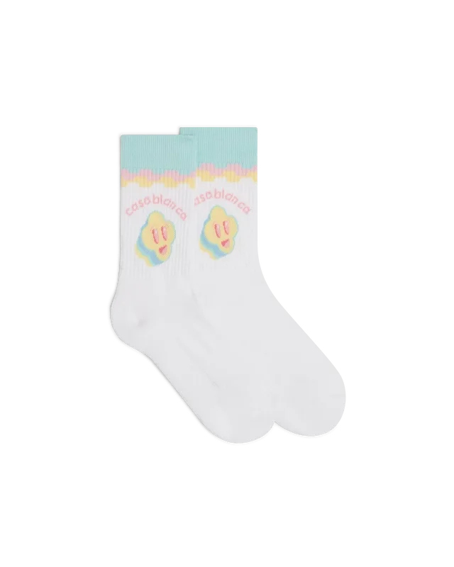 Die „For the Love of Dance“-Socken zeichnen sich durch ein raffiniertes Design aus, das das Smiley-Gesicht und dessen Entwicklung als grafisches Element innerhalb der House-Musikszene zeigt.