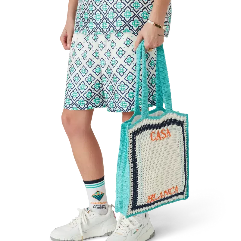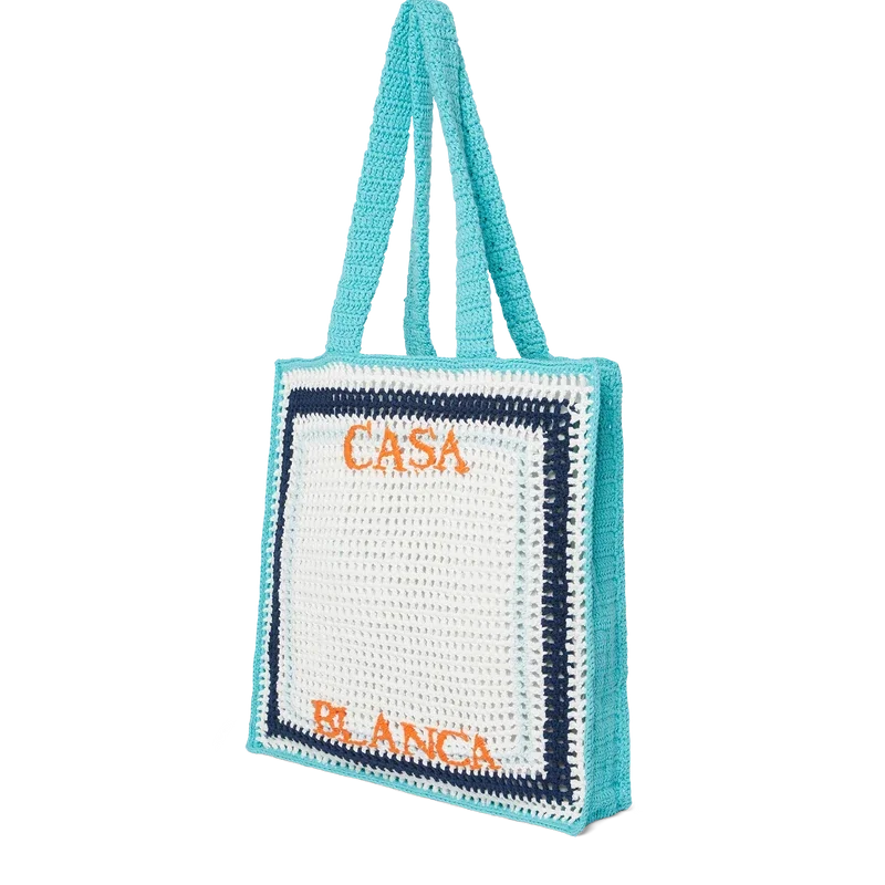 Die Stripe Crochet Bag ist eine gestrickte Tasche aus gehäkelter Baumwolle und zeichnet sich durch eine lockere Silhouette aus. Abgerundet wird sie durch ein gesticktes, übereinanderliegendes Casablanca-Logo sowie Riemen, mit denen die Tasche als Tote-Bag über der Schulter oder in der Hand getragen werden kann.