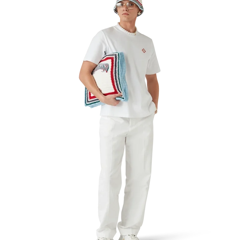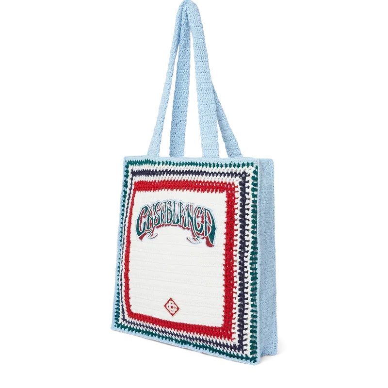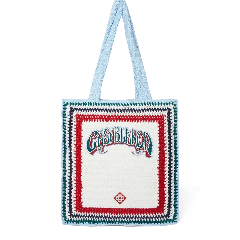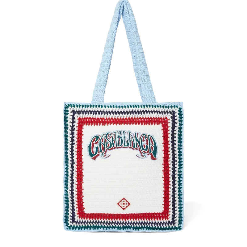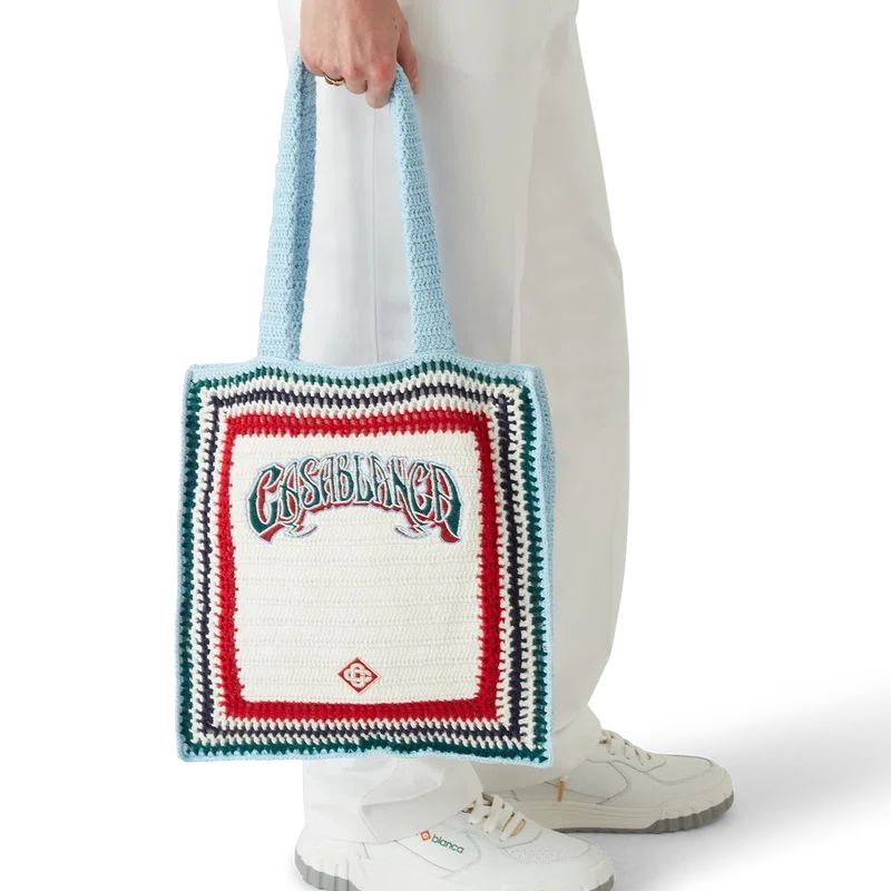 Die „Gothic Crochet Bag“ ist eine im Strick-Look gestaltete Tasche aus Häkelbaumwollstoff mit einer lockeren Silhouette. Sie ist verziert mit einer gestickten, handgezeichneten Schrift des Casablanca-Logos, inspiriert von der in Tattoos verwendeten Gothic-Schriftart, und verfügt über Riemen, mit denen die Tasche im Tote-Stil über der Schulter oder in der Hand getragen werden kann.