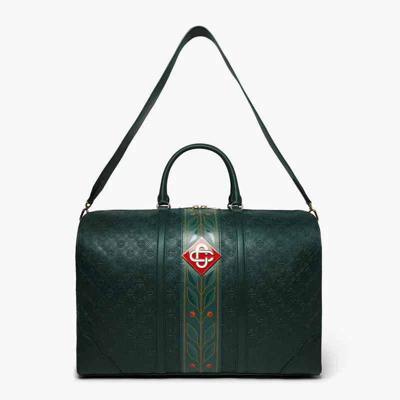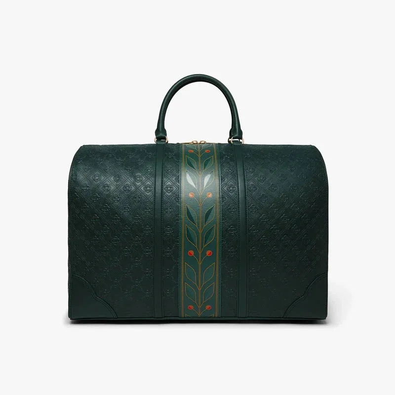 Die grüne Monogram-Wochenendtasche ist aus italienischem Leder gefertigt und an der Seite mit dem charakteristischen Rautenlogo des Hauses verziert. Abgerundet wird sie durch das charakteristische Lorbeerblatt-Motiv des Hauses, Tragegriffe, einen Reißverschluss, einen Schulterriemen, eine Innentasche und Beschläge aus Messing. Im Lieferumfang enthalten sind eine Geschenkbox der Marke Casablanca, ein Staubbeutel und ein Produktdetail-Handbuch.