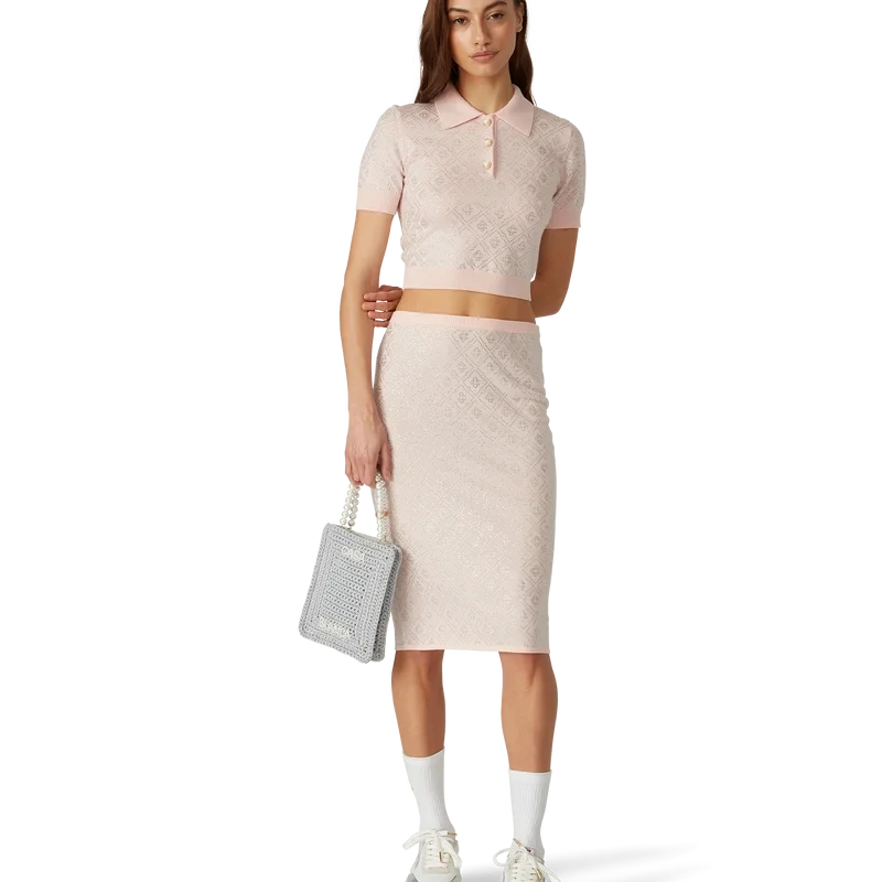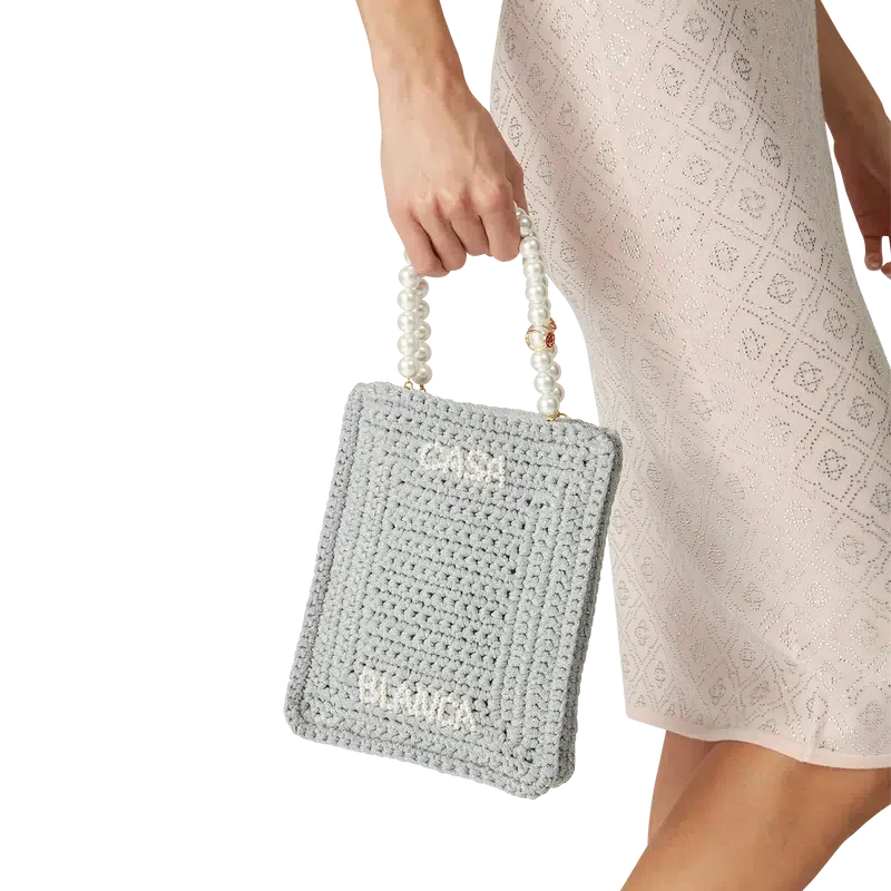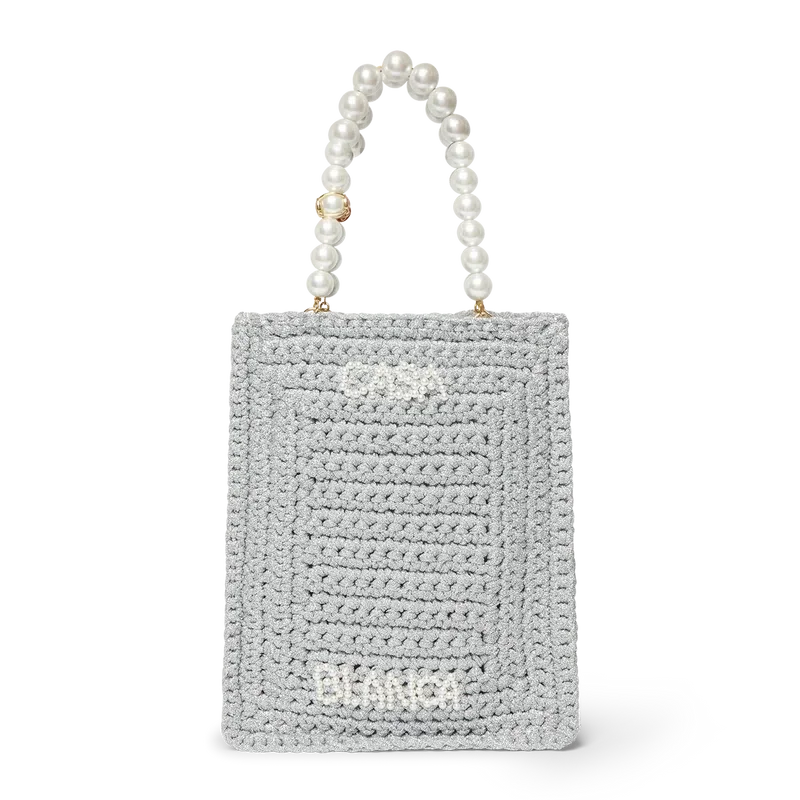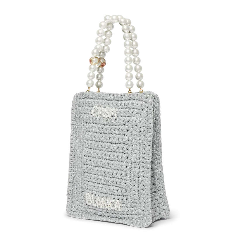 Die Pearl Mini Crochet Bag ist aus einem metallischen Häkelstoff mit Perlen verziert. Mit zwei Tragegriffen und dem „Casablanca Text“-Logo versehen.