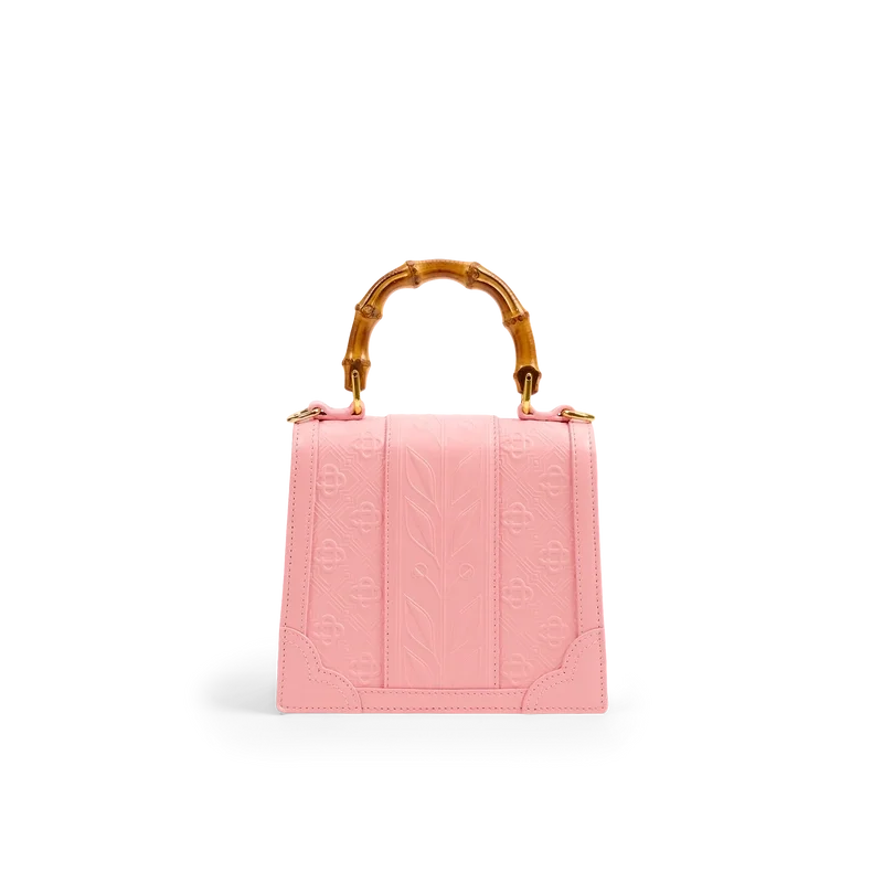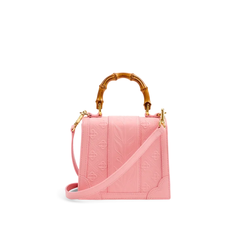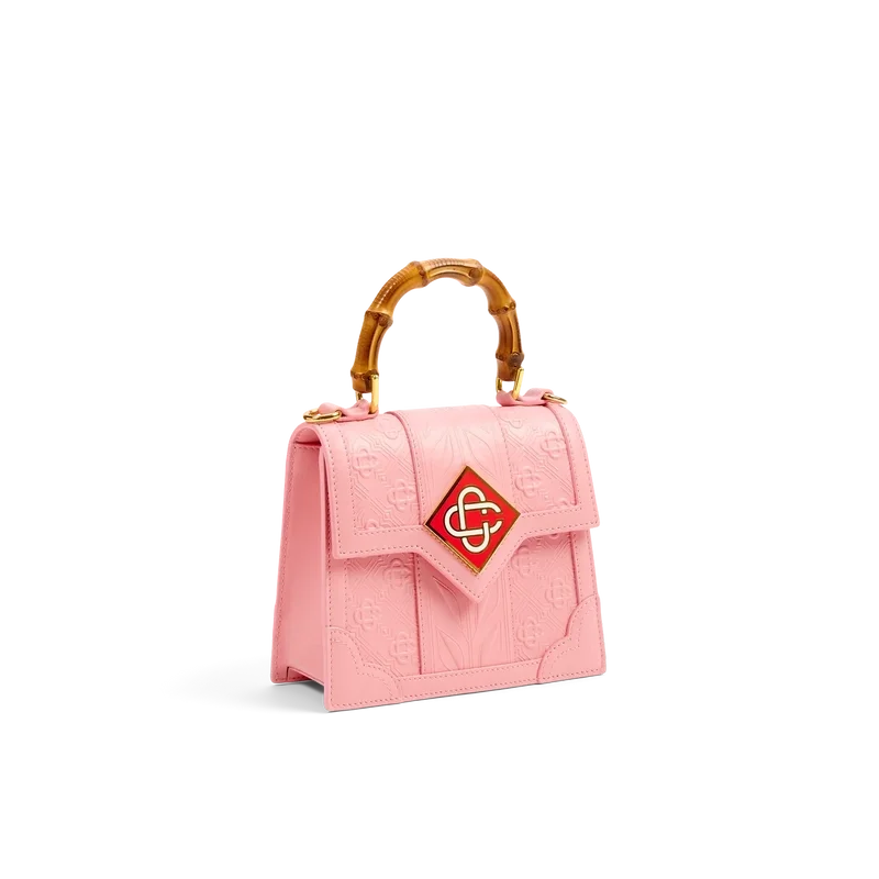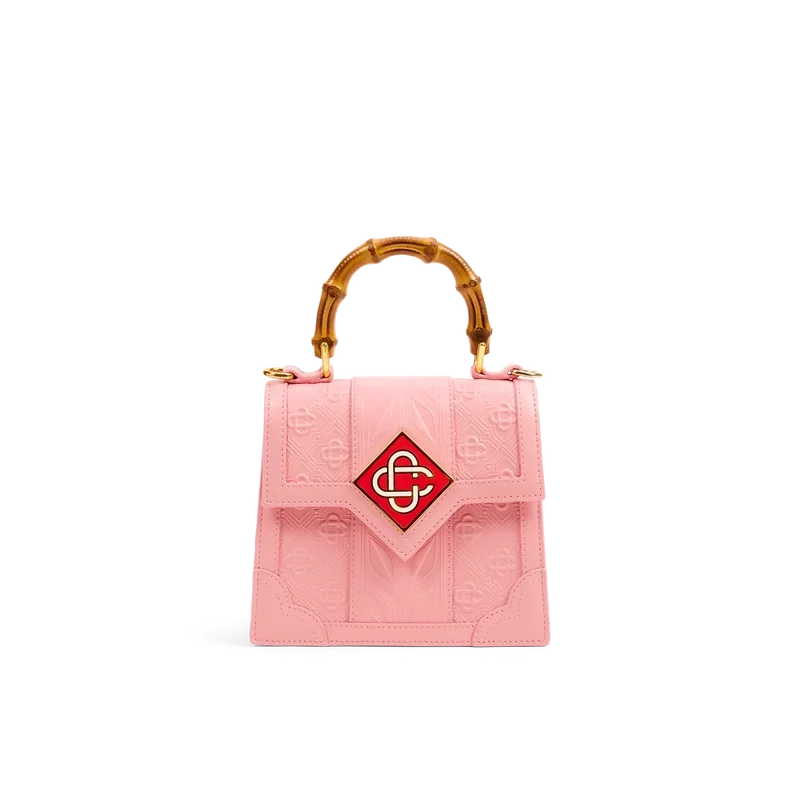 Die rosa Mini Jeanne Tasche ist das charakteristische Modell des Hauses mit Bambusgriffen und Klappenverschluss, das für diese Saison neu interpretiert wurde. Die aus 100 % italienischem Kalbsleder gefertigte rosa Handtasche ist mit einem Casablanca-Diamond Monogram in kontrastierendem Rot und einem passenden Umhängeriemen versehen.