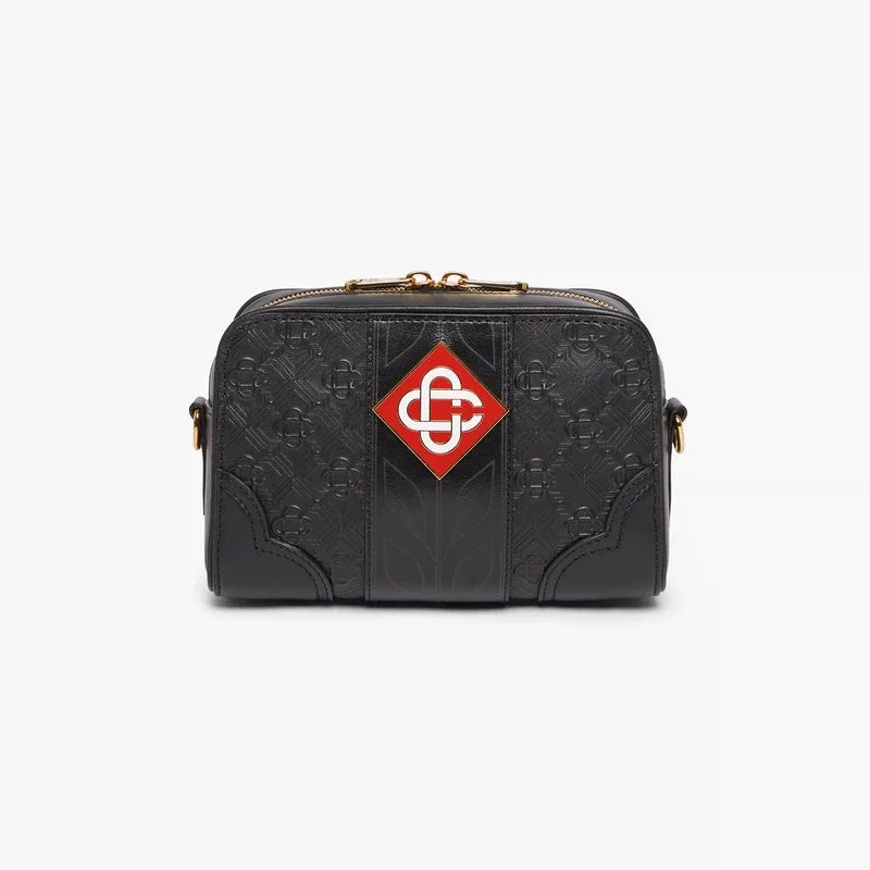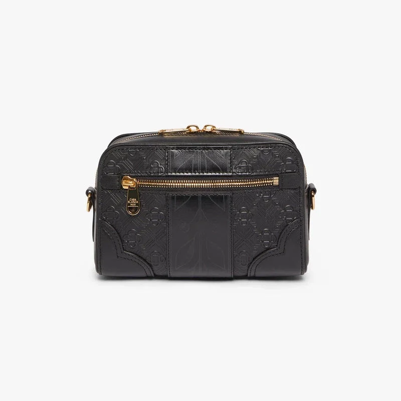 Die schwarze Monogram-Umhängetasche ist aus italienischem Kalbsleder gefertigt und mit dem Monogramm-Muster des Hauses sowie dem charakteristischen Diamant-Logo an der Seite versehen. Abgerundet wird sie durch das charakteristische Lorbeerblatt-Motiv des Hauses, einen Schulterriemen, einen Reißverschluss, eine Außentasche mit Reißverschluss, eine Innentasche sowie Beschläge aus Messing. Im Lieferumfang enthalten sind eine Geschenkbox mit Casablanca-Logo, ein Staubbeutel und eine Produktbeschreibung.