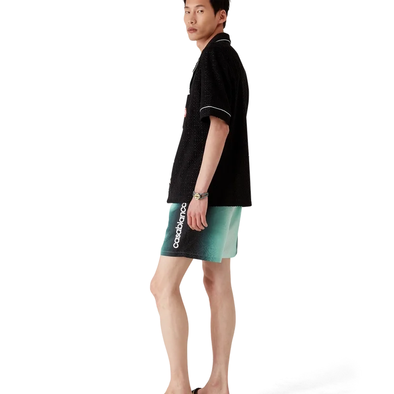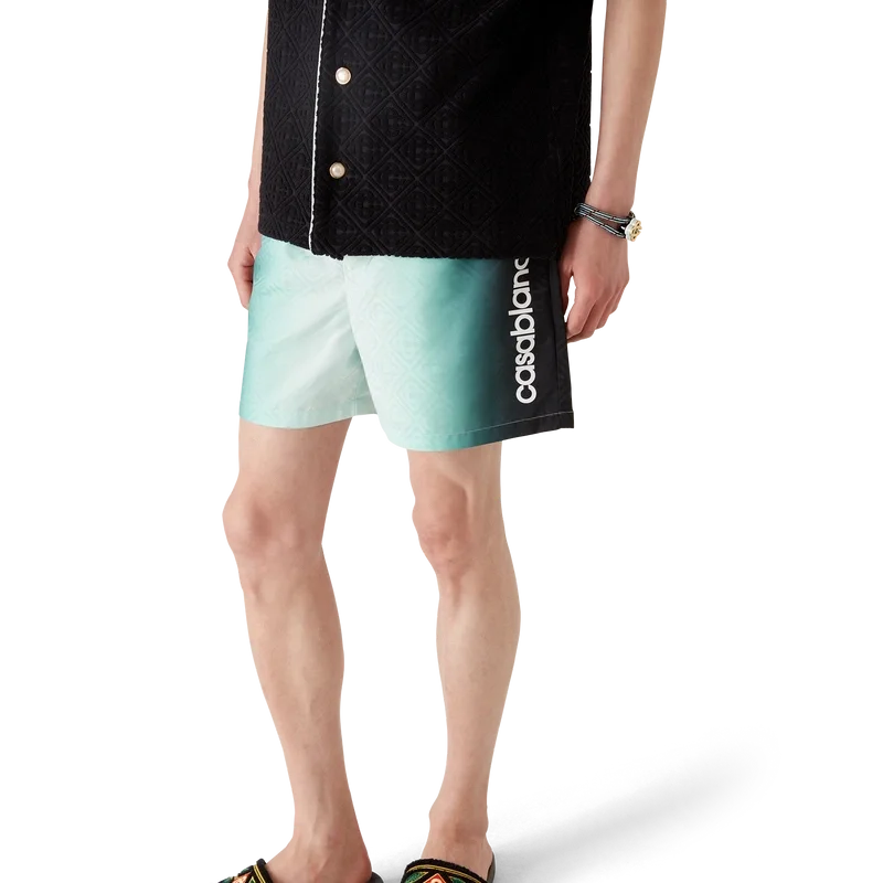 Die Gradient Jacquard-Shorts sind ein klassisches Design der Bademode aus einem technischen Gradient-Badematerial, das an der Seite mit dem charakteristischen Casablanca-Logo des Hauses verziert ist. Abgerundet durch einen elastischen Bund, einen innenliegenden Kordelzug, ein Futter, eine Innentasche und Seitentaschen in der Naht.