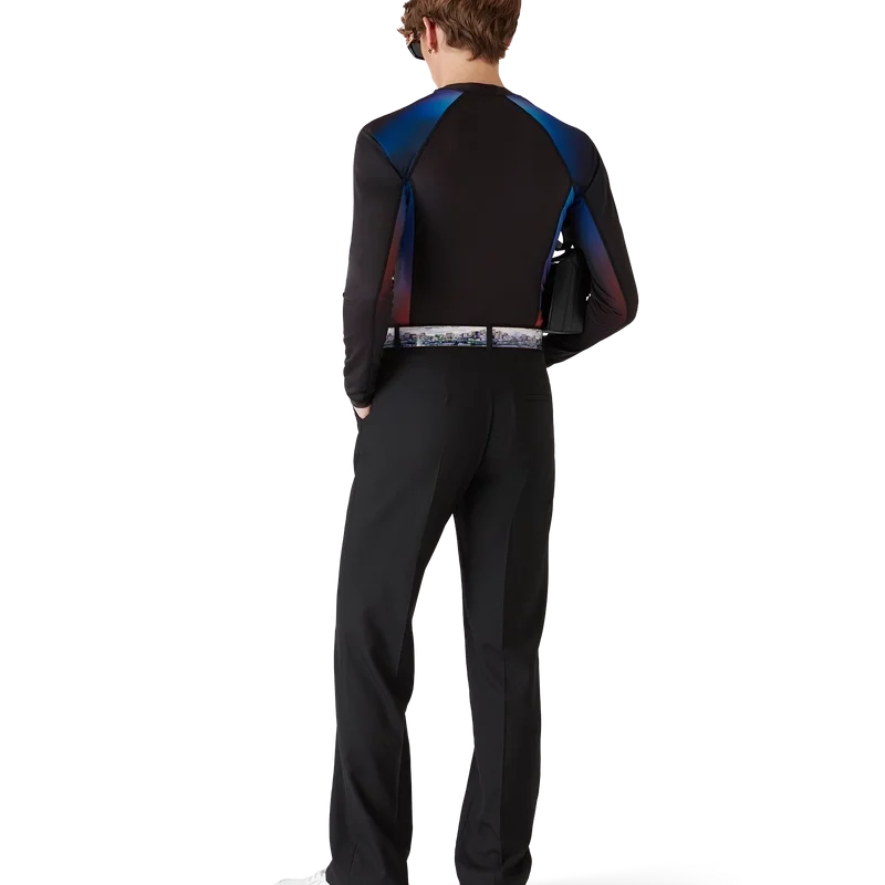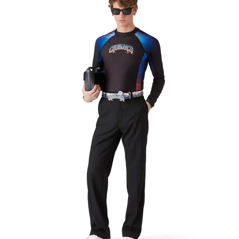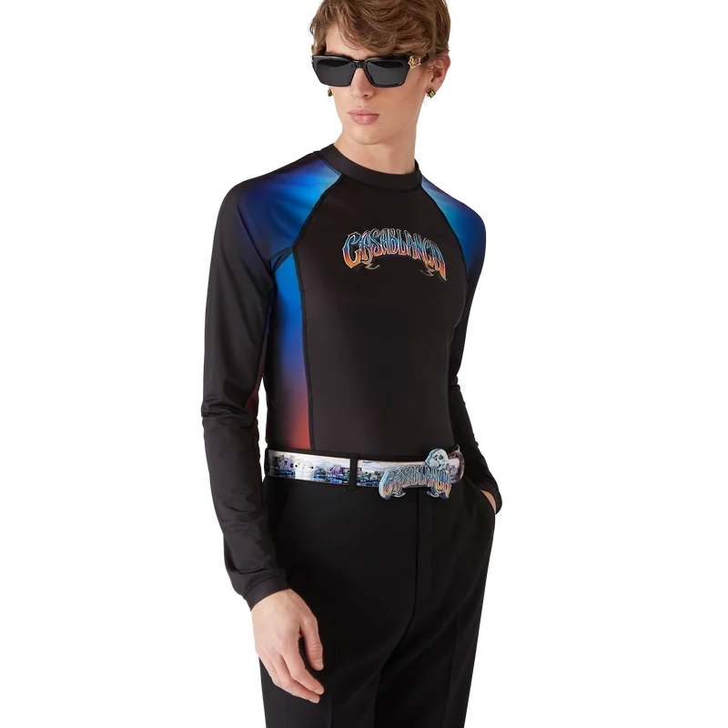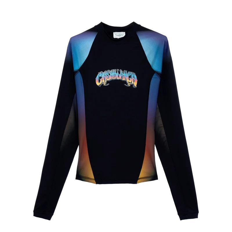Das Gradient Rash Vest ist ein eng anliegendes, bedrucktes Langarm-Modell mit den Farbverläufen der Saison, gefertigt aus Schwimmstoff. Mit handgezeichneter Typografie des Casablanca-Logos, inspiriert von der in Tattoos verwendeten gotischen Schriftart, hohem Kragen sowie Seiten- und Ärmelpartien mit Farbverlauf.