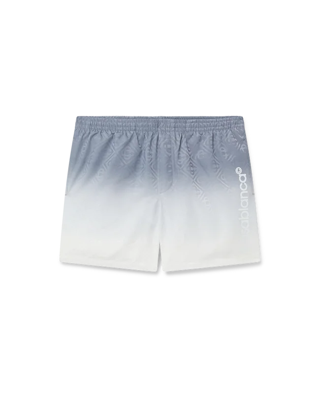 Die Jacquard-Badeshorts mit Farbverlauf sind ein durchgehend bedrucktes Modell aus atmungsaktivem Polyestergewebe. Mit elastischem Bund mit innenliegendem Kordelzug, Nahttaschen und Futter.