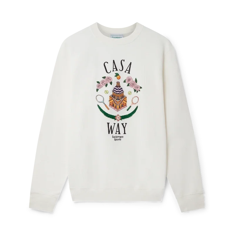 Das Casa Way Off-White Unisex-Sweatshirt verfügt über gestickte Illustrationen von Sportgeräten und floralen Details. Das Modell aus Bio-Baumwolle ist ein klassisches Langarm-Sweatshirt mit Rundhalsausschnitt und wurde für eine lockere Passform entworfen.