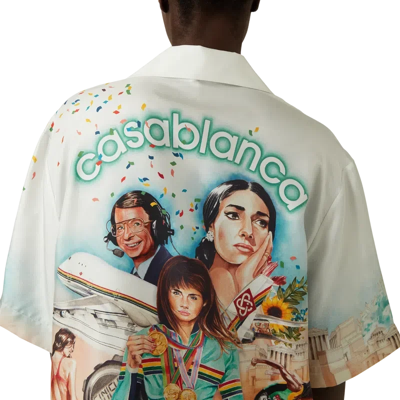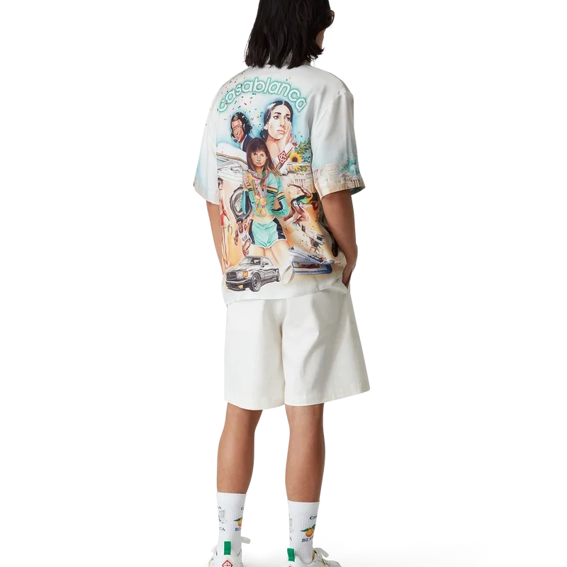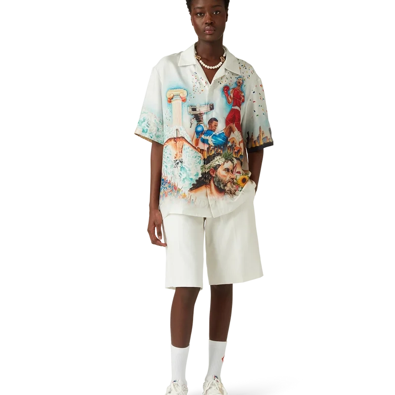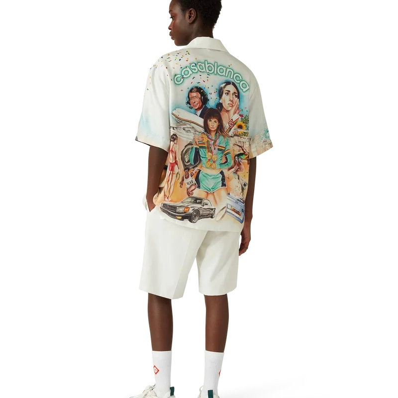 Das Celebration Du Sport Seidenhemd ist ein kurzärmeliges Modell mit Allover-Print aus Seidentwill, das mit saisonalen Motiven verziert ist. Diese sind inspiriert von der Interpretation des Hauses eines klassischen Filmplakat-Layouts mit unseren eigenen Figuren in dieser Welt. Abgerundet wird das Design durch die charakteristischen Corozo-Knöpfe mit ineinander verschlungenem Cc-Logo, einen verdeckten Knopfverschluss, eine Brusttasche und einen kubanischen Kragen.