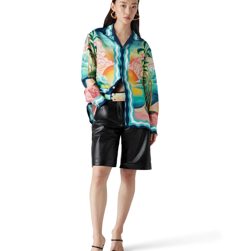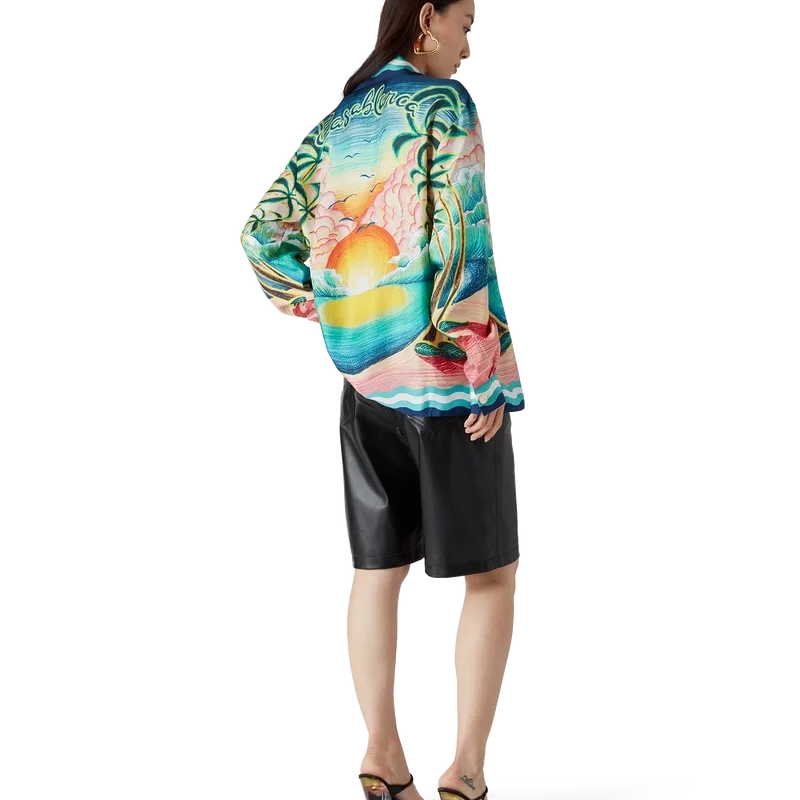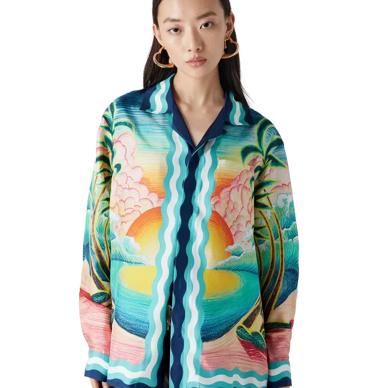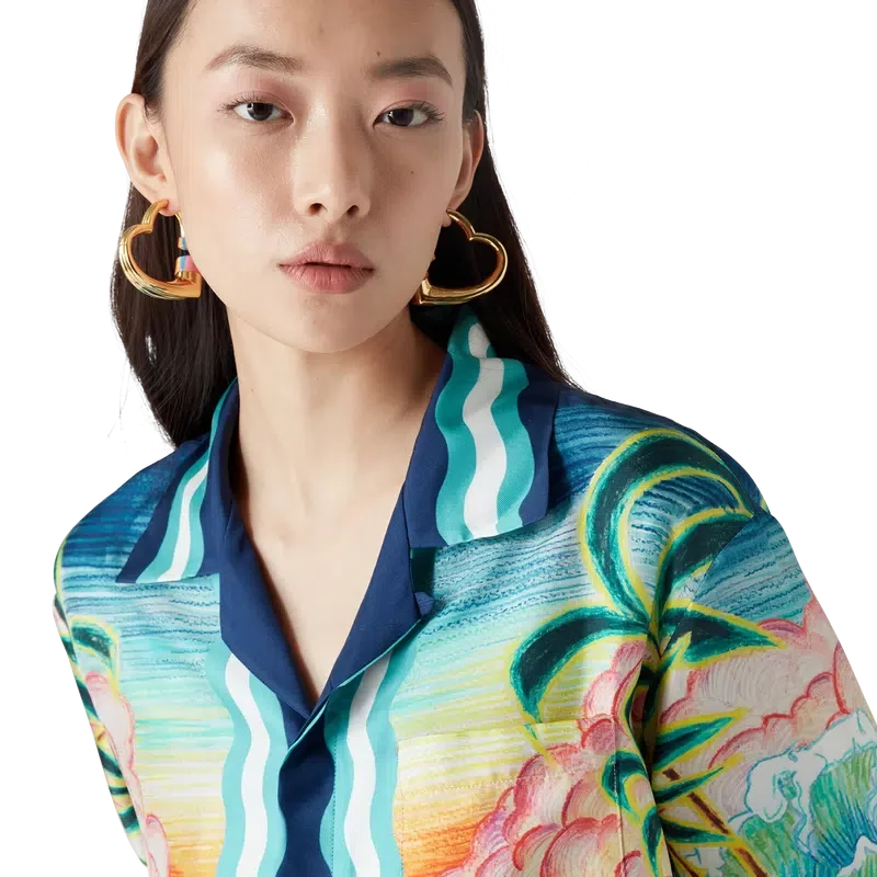 Das Seidenhemd „Danse De La Mer“ ist ein langärmeliges Modell mit durchgehendem Druck, das speziell für die Kollektion entworfene handgemalte Motive zeigt und aus Seidenstoff gefertigt ist. Es verfügt über einen Knopfverschluss, ineinander verschlungene Cc-Logo-Knöpfe aus Corozo, charakteristische Emailleknöpfe mit Goldrand sowie Streifenelemente im Memphis-Wave-Stil an Saum, Manschetten, Kragen und Knopfleiste.