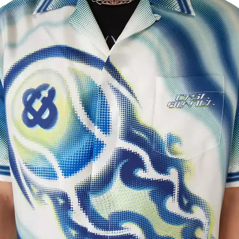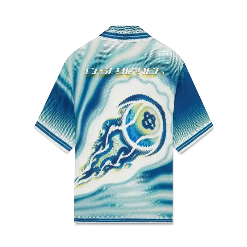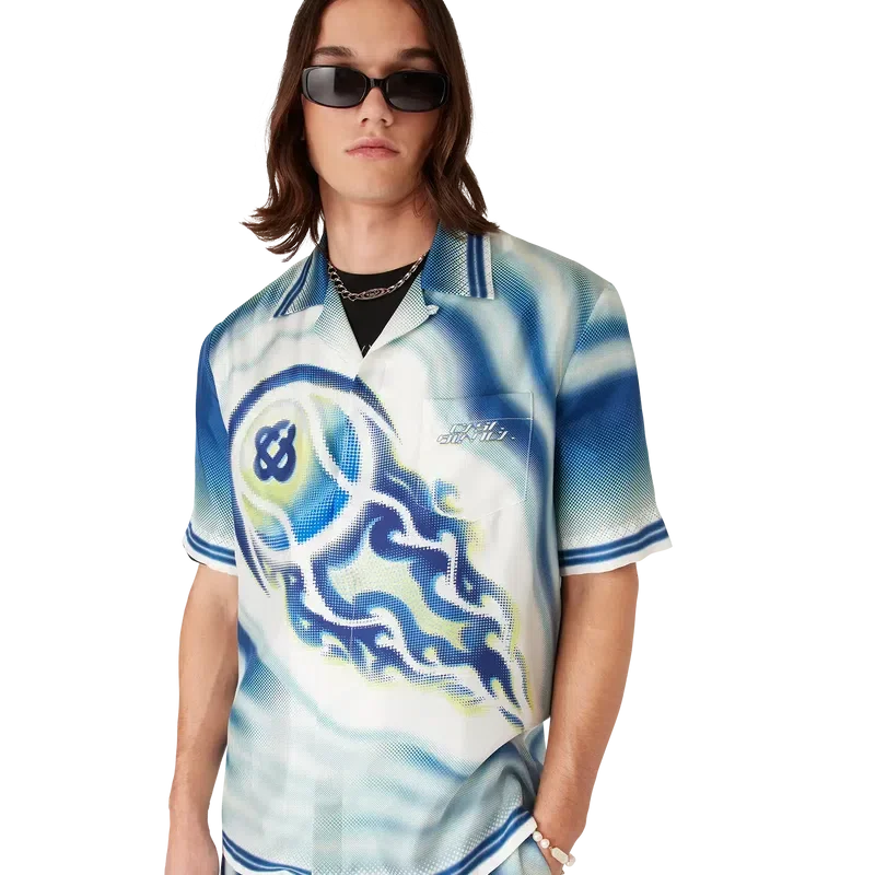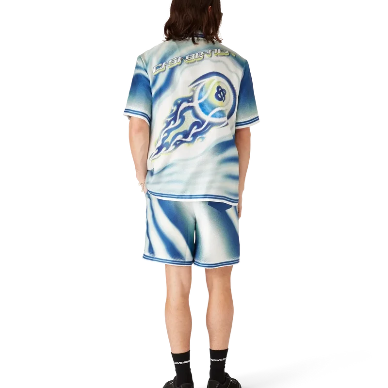 Das kurzärmelige Seidenhemd „The Art of the Serve“ ist ein durchgehend bedrucktes Design mit dem charakteristischen Tennisball-Motiv des Hauses im Flug, das die grundlegende Balance aus Kraft, Geschwindigkeit und Kontrolle widerspiegelt. Abgerundet durch einen Kragen im kubanischen Stil, das Casablanca-Logo, einen Knopfverschluss, Corozo-Knöpfe mit dem ineinander verschlungenen Cc-Logo, eine Brusttasche sowie Streifenverzierungen an Kragen, Manschetten und Saum.<!–