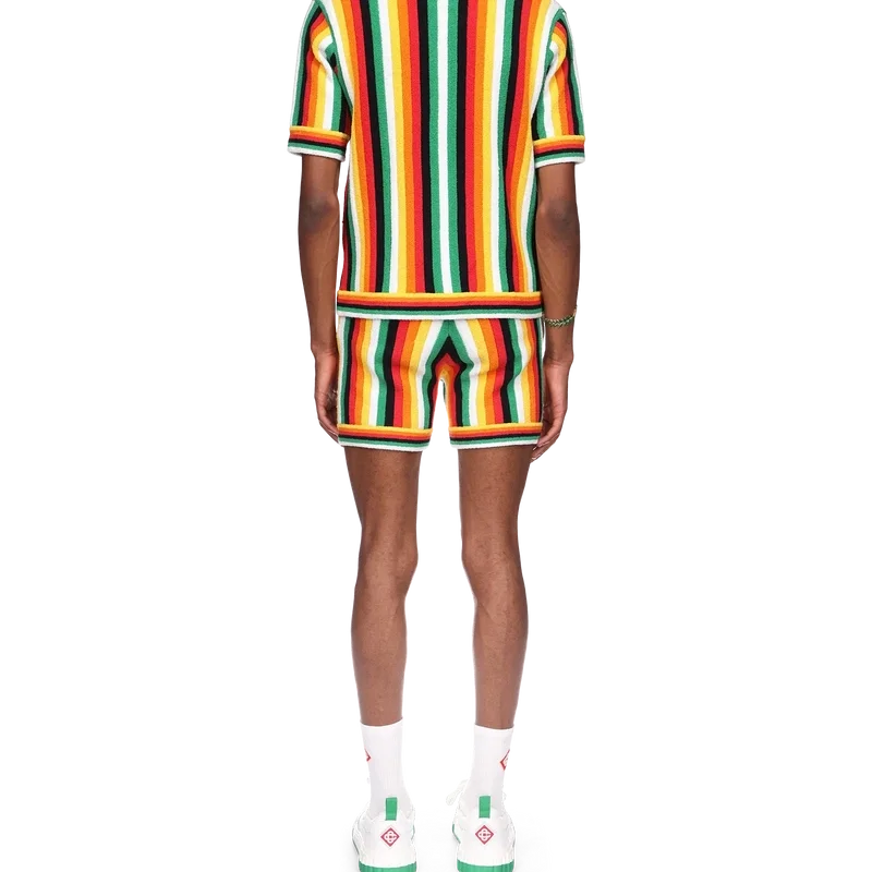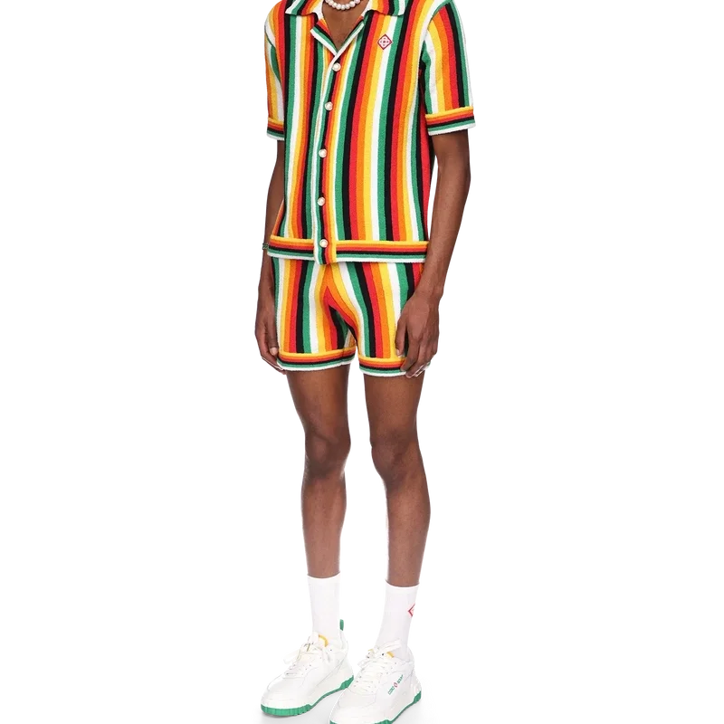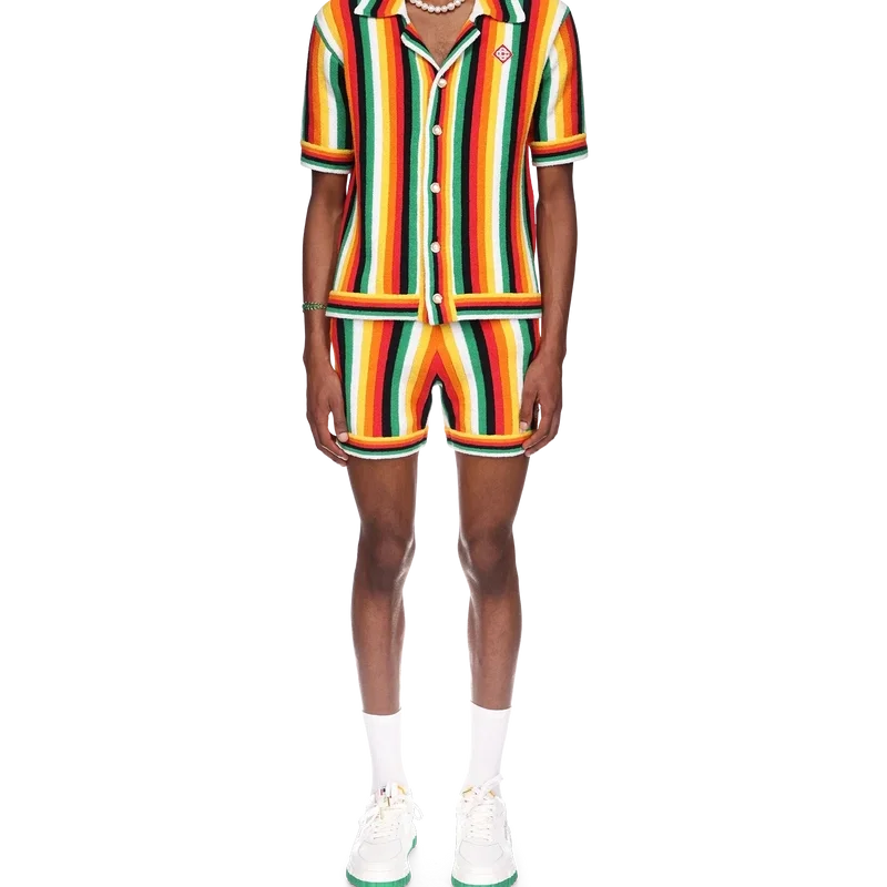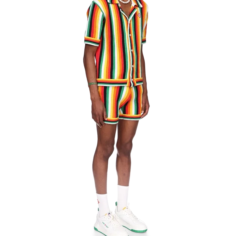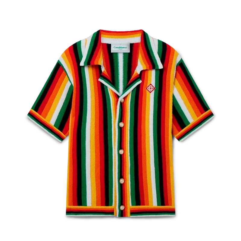 Das gestreifte Frottee-Hemd ist ein Strickmodell aus einem Frottee-Stoff aus Baumwollmischung und präsentiert die Farben der Saison, die für den reichen Austausch zwischen den kulturellen Disziplinen in der afrikanischen Kunst, Musik und im Film stehen. Abgerundet wird es durch einen gerippten Kragen, die für das Haus typischen Perlenknöpfe mit Goldrand und das charakteristische Diamant-Logo-Patch.