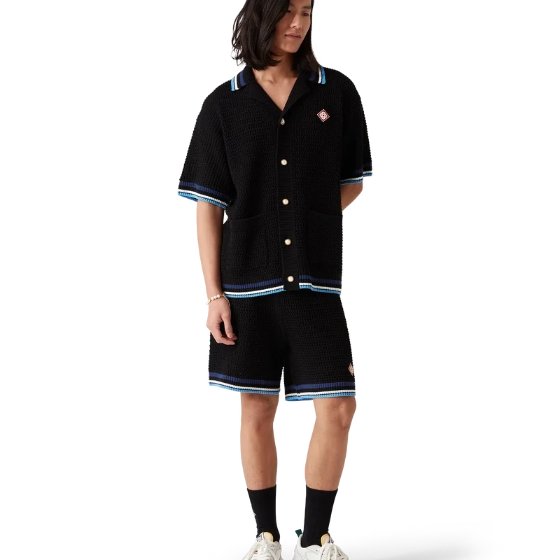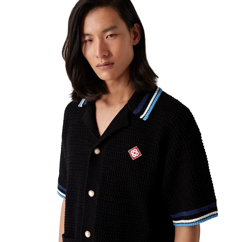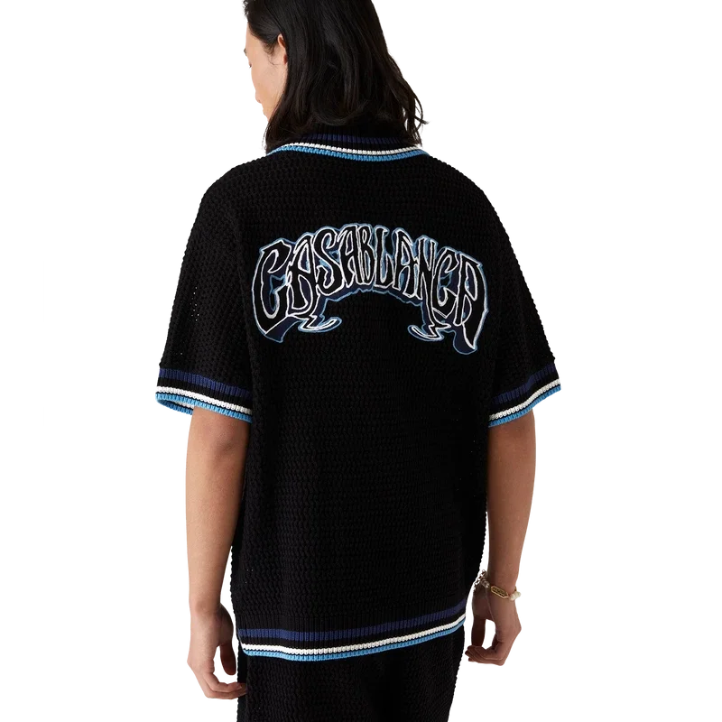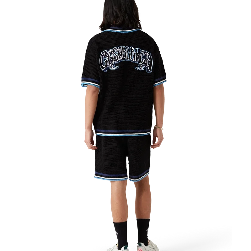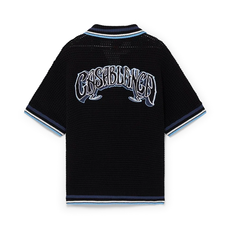 Das Gothic Crochet Shirt ist ein kurzärmeliges Strickmodell aus gehäkelter Baumwolle mit dem charakteristischen Rautenlogo des Hauses. Abgerundet wird es durch charakteristische goldgerahmte Perlknöpfe, aufgesetzte Brusttaschen, eine handgezeichnete Typografie des Casablanca-Logos, inspiriert von der in Tattoos verwendeten Gothic-Schrift, sowie gestreifte Kanten an Kragen, Manschetten und Saum.
