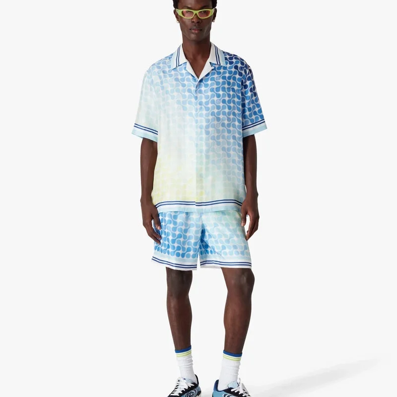 Das Tennis-Kachel-Seidenhemd mit kurzen Ärmeln ist ein durchgehend bedrucktes Design, das das saisonale Motiv mit einem sanft ansteigenden und abfallenden Muster aus sich kreuzenden Logos und Tennisbällen zeigt, die durch den saisonalen Farbverlauf miteinander verschmelzen. Abgerundet durch einen Kragen im kubanischen Stil, Knopfverschluss, Corozo-Knöpfe mit ineinander verschlungenem Cc-Logo, eine Brusttasche sowie Streifenverzierungen an Kragen, Manschetten und Saum.