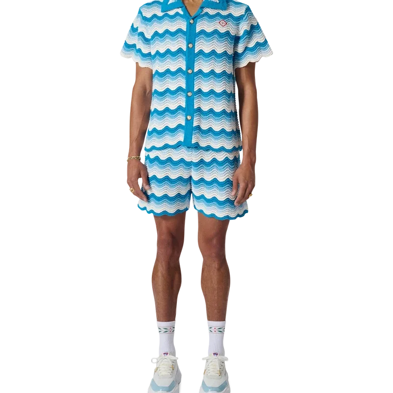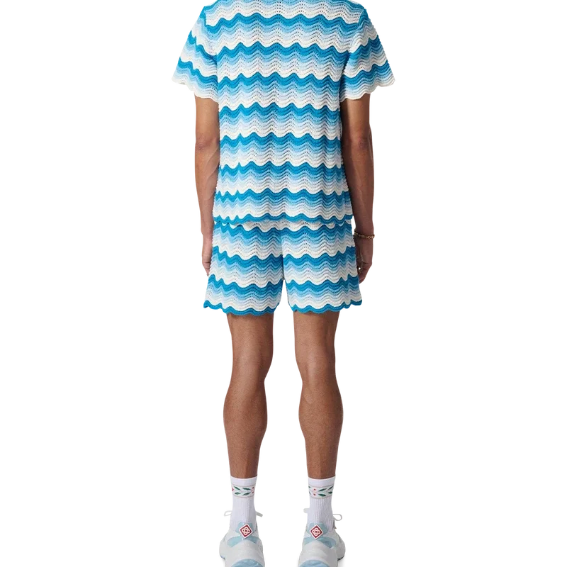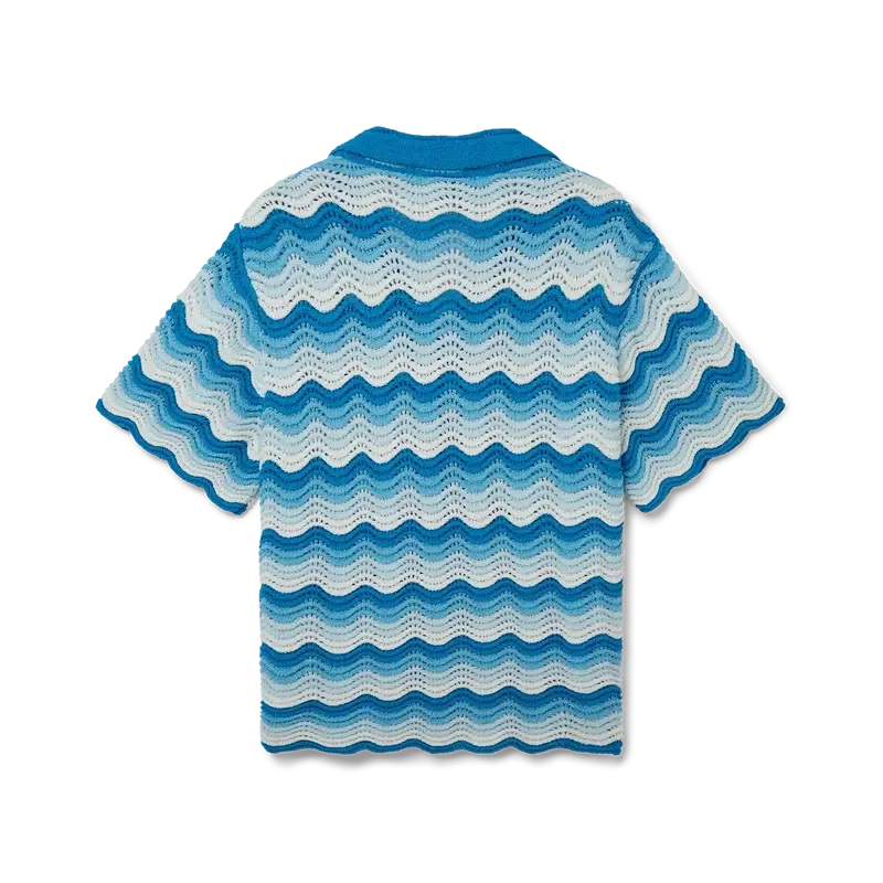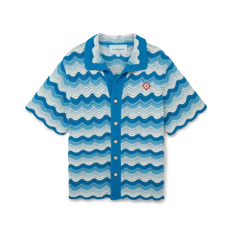 Das Hemd mit wellenförmigem Farbverlauf ist ein typisches Casablanca-Modell aus einem weichen, strukturierten, offen gewebten Häkelstoff in Blautönen – das ultimative Sommer-Basic. Mit unserem charakteristischen goldenen Perlenknopfverschluss, offenem Kragen, kurzen Ärmeln und einem Casablanca Paris-Markenlabel – entworfen für eine klassische Passform.