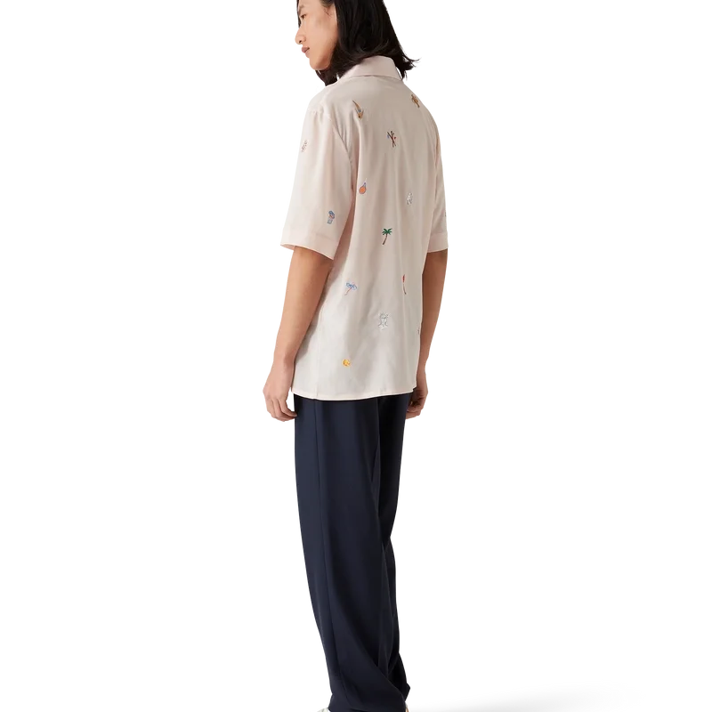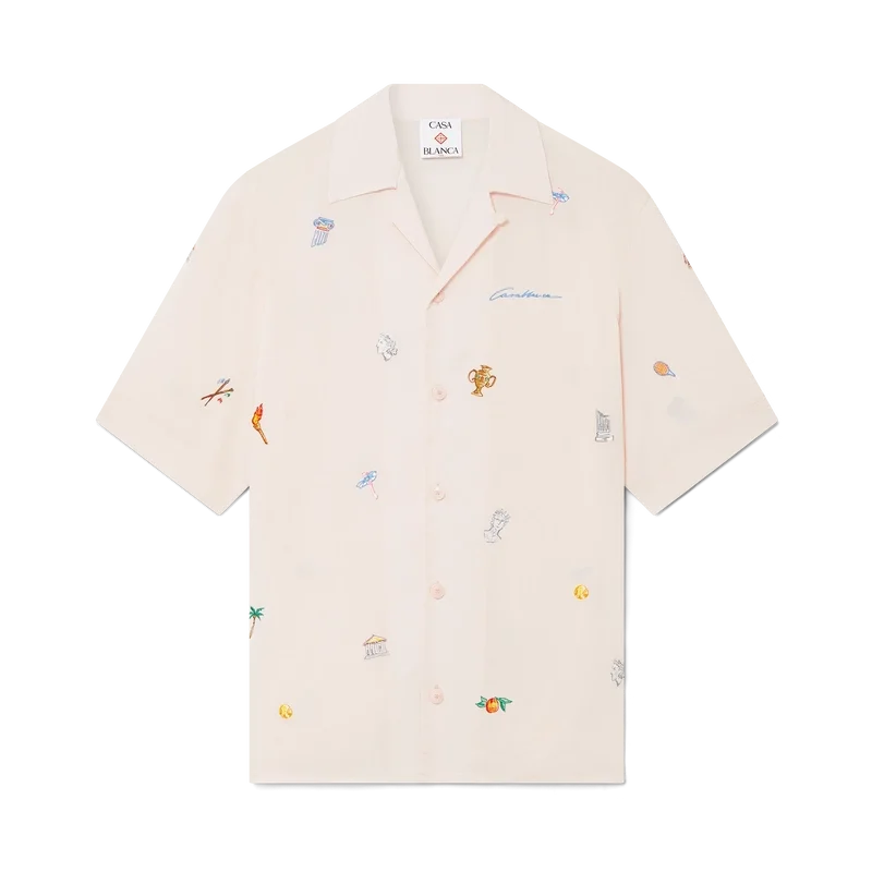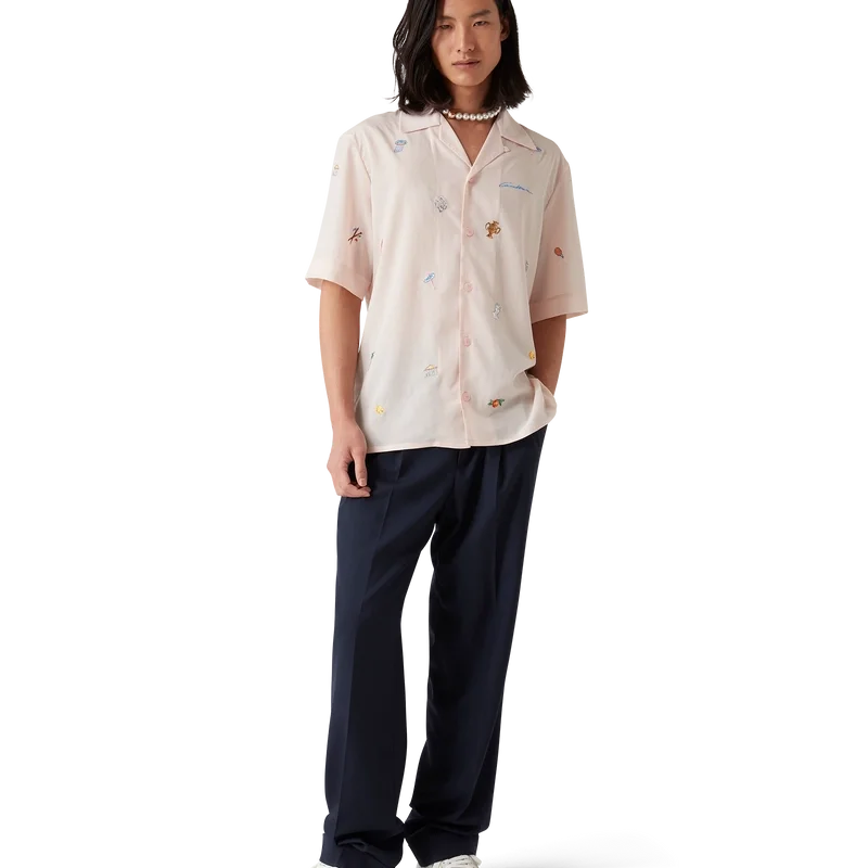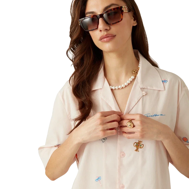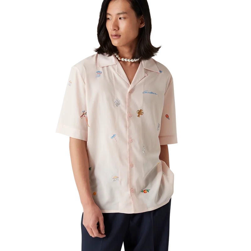 Das Hemd mit gesticktem Motiv ist ein kurzärmeliges Modell aus besticktem Stoff mit Stickereien, die die Symbolik des Hauses in Bezug auf Natur, Tennis und Architektur darstellen. Abgerundet durch einen Knopfverschluss, Corozo-Knöpfe mit ineinander verschlungenem CC-Logo und einen kubanischen Kragen.