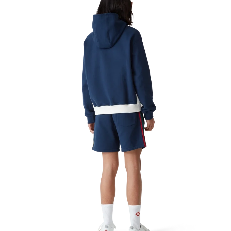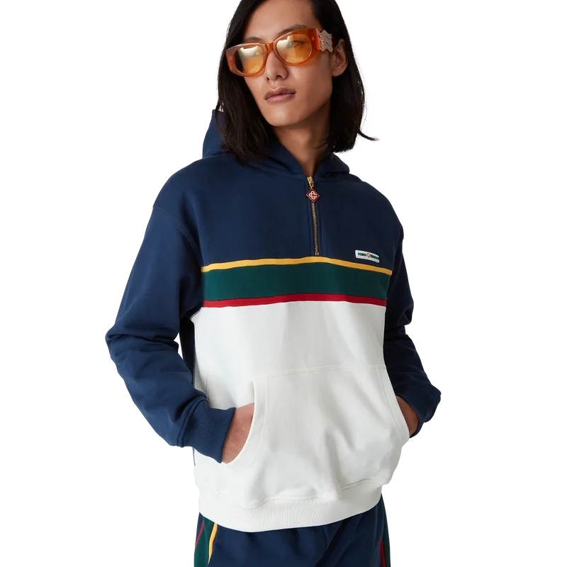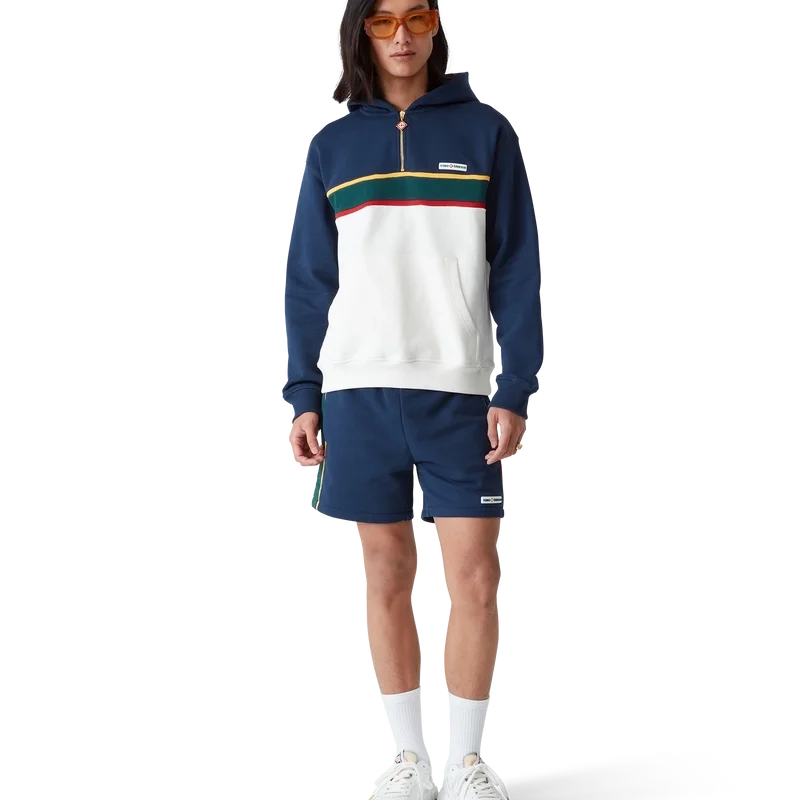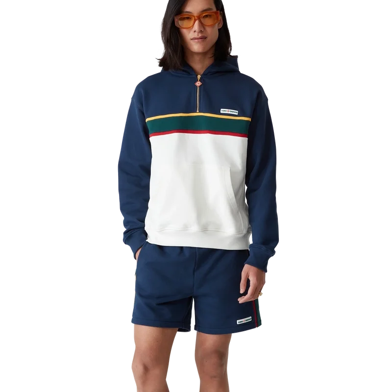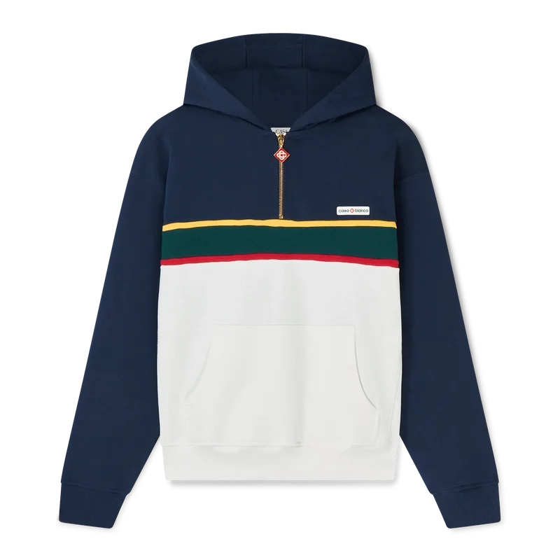 Das Colour-Block-Kapuzensweatshirt mit Viertelreißverschluss ist ein langärmeliges Sportbekleidungsmodell aus Bio-Baumwoll-Loopback-Stoff. Mit Kapuze, goldfarbenen Kordelzügen für sicheren Verschluss, Kontrasteinsätzen, einer Känguru-Fronttasche sowie gerippten Bündchen und Saum.