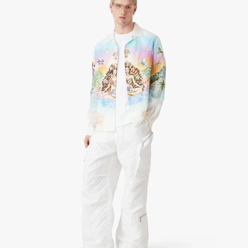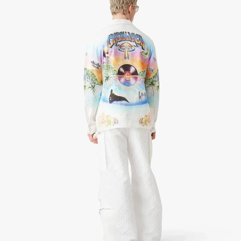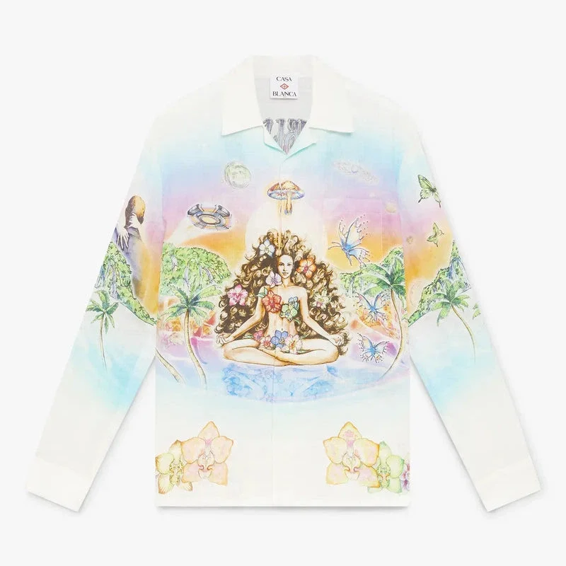 Das Innersense-Leinenhemd mit langen Ärmeln ist ein durchgehend bedrucktes Design mit einem Motiv, das Dualität verkörpert und eine idealistische Utopie darstellt, in der Musik alles durchdringt: eine Frau, die Unschuld verkörpert, umgeben von Orchideen, schwebt auf CDs und treibt inmitten von Wasser, Schmetterlingen und UFOs. Abgerundet wird das Design durch einen Kragen im kubanischen Stil, einen Knopfverschluss, Corozo-Knöpfe mit ineinander verschlungenem CC-Logo, eine Brusttasche und emaillierte Knöpfe mit goldenem Rand an den Manschetten.