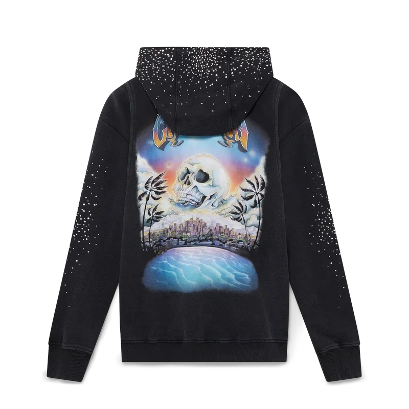 Das La Pramonition Kristall-Kapuzensweatshirt mit Reißverschluss ist ein bedrucktes Langarm-Modell aus Bio-Baumwollstoff mit Hotfix-Kristallen. Es zeigt ein charakteristisches Design, inspiriert von einer unheimlichen Vision der Skyline von La bei Nacht, mit UFO-Elementen, die an Vintage-Science-Fiction-Inspirationen anknüpfen.