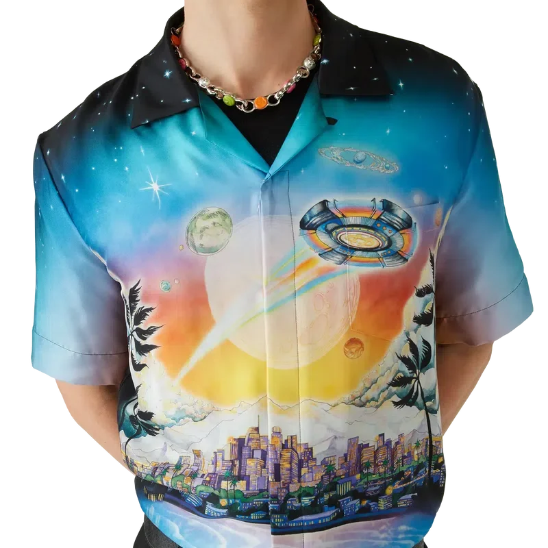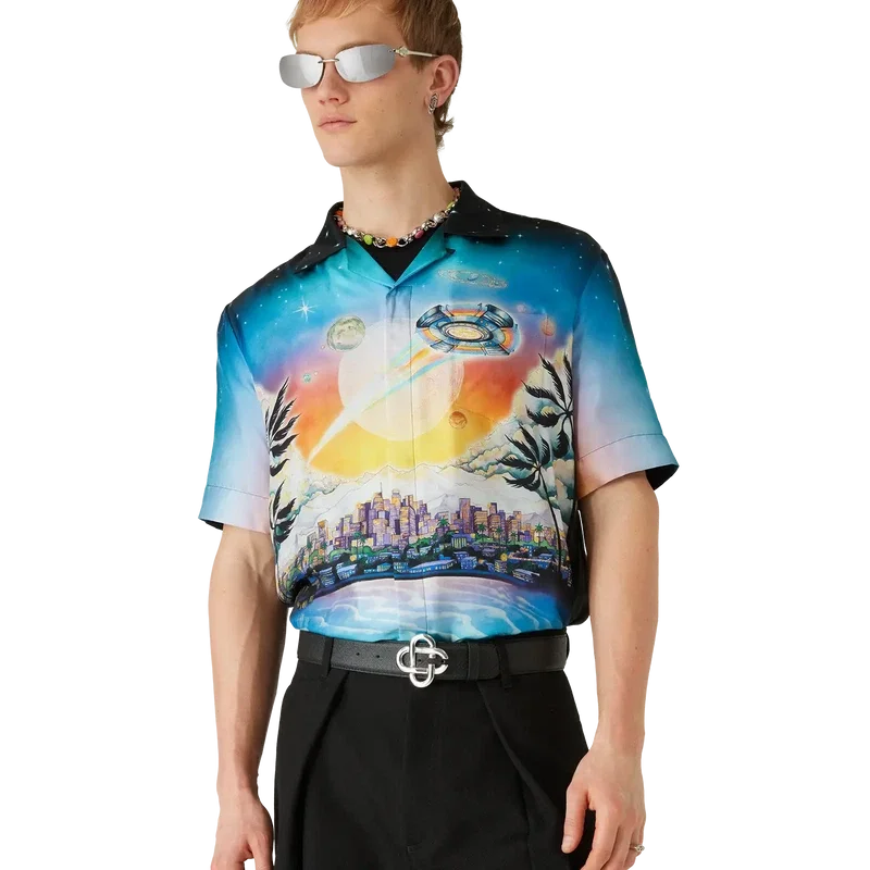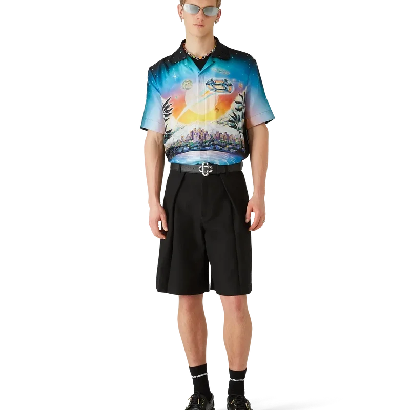 Das La Pramonition Kurzarm-Seidenhemd besticht durch ein raffiniertes Druckdesign mit Motiven, die von einer unheimlichen Vision der Skyline von La bei Nacht inspiriert sind, ergänzt durch UFO-Elemente, die an Vintage-Science-Fiction-Inspirationen anknüpfen. Abgerundet wird das Design durch einen Kubanerkragen, eine Brusttasche sowie einen verdeckten Knopfverschluss mit ineinandergreifenden CC-Corozo-Knöpfen.