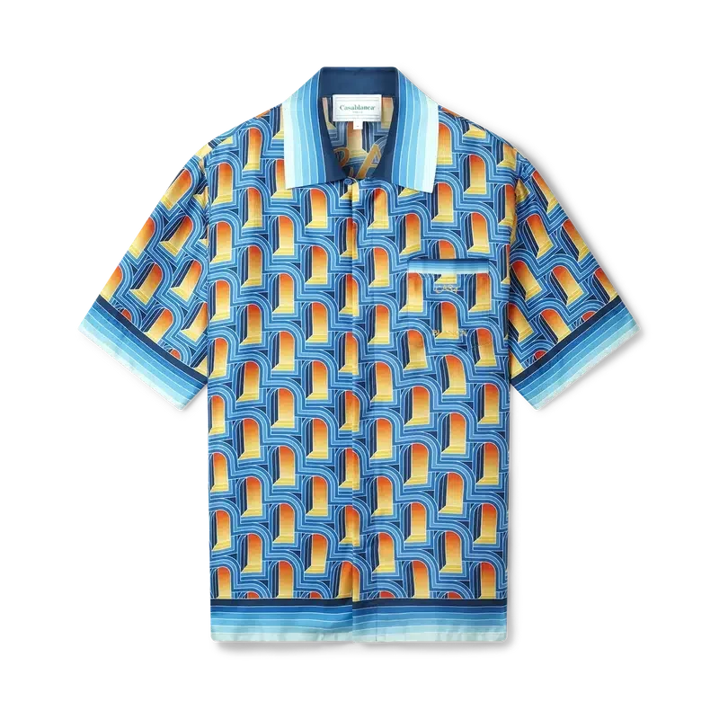 Das L’arche De Nuit Kurzarm-Seidenhemd für Herren präsentiert den wiederkehrenden Bogen-Print der Saison in einer nächtlichen Farbgebung aus tiefen Blautönen. Mit einem farblich abgestimmten, blau gestreiften offenen Kragen und einem geschlossenen Kragenverschluss.