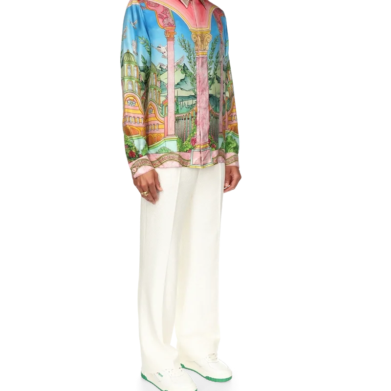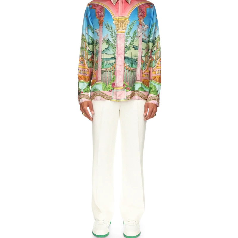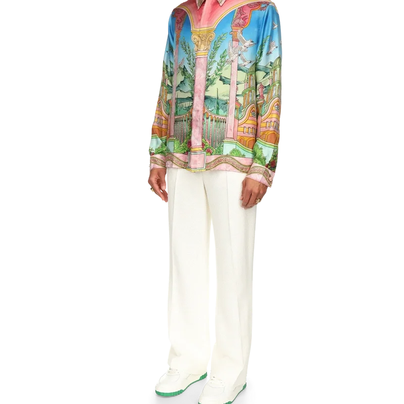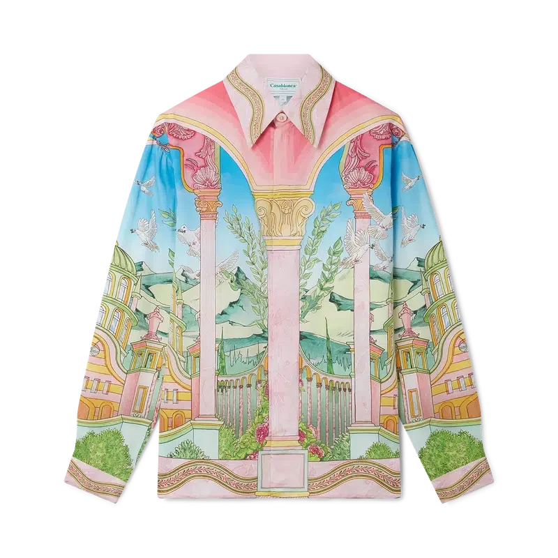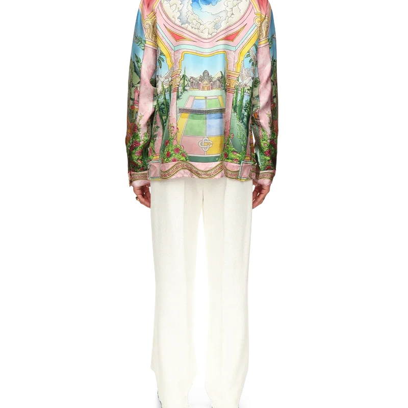 Das Le Jardin Ideal Hemd ist ein bedrucktes Langarm-Modell, das die ätherische Fantasiewelt von Casablanca zeigt. Mit den für das Haus typischen Perlmuttknöpfen mit Emaille-Rand, Knopfleiste, einem Casablanca-Markenlabel und floralen Details an Kragen, Manschetten und Saum.