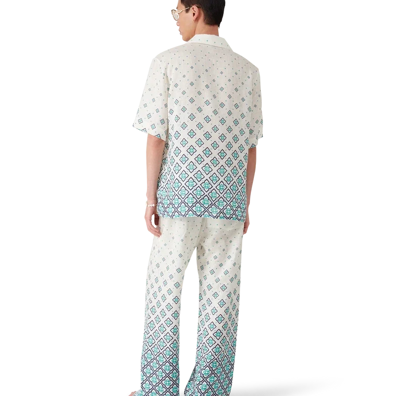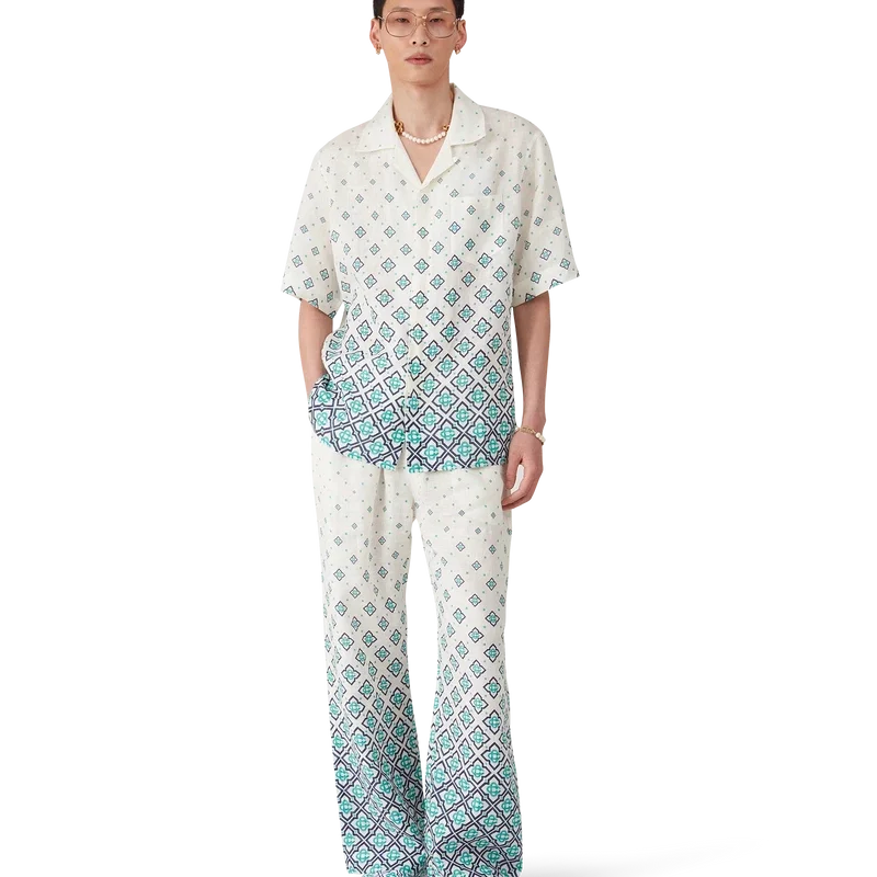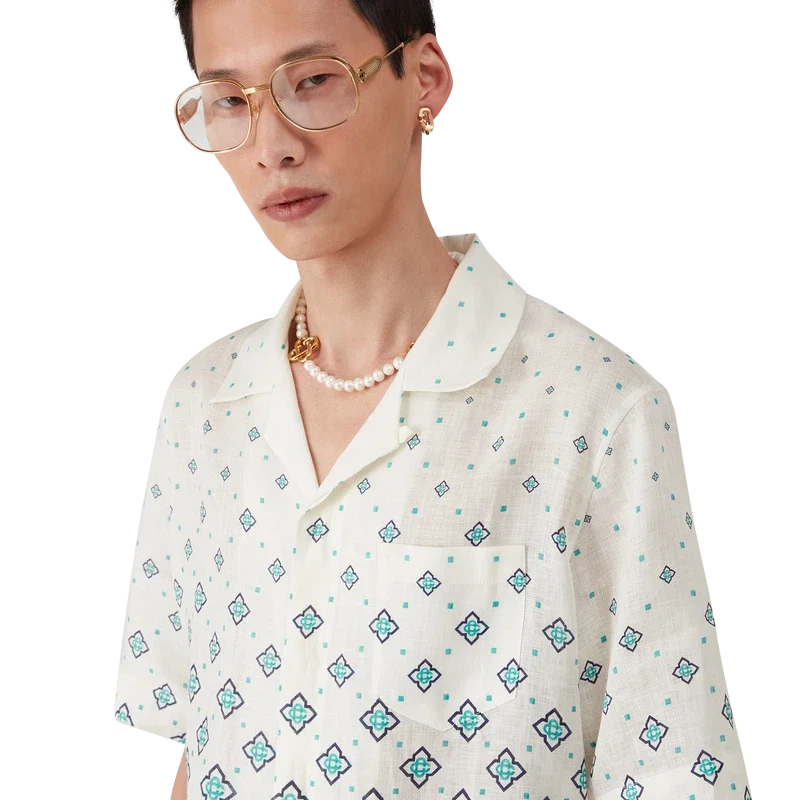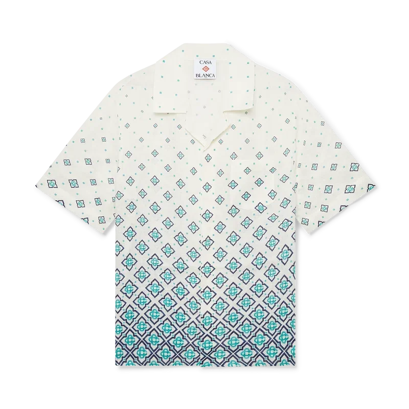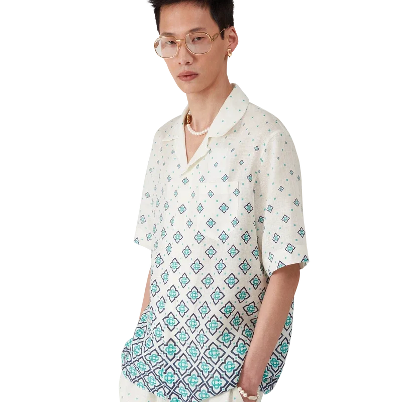 Das Leinenhemd mit Monogramm-Farbverlauf ist ein bedrucktes Kurzarmmodell aus Leinenstoff. Es verfügt über einen Kubanerkragen, einen Knopfverschluss mit ineinander verschlungenen CC-Logo-Knöpfen aus Corozo sowie eine Brusttasche. Es ist dazu gedacht, mit der passenden Leinenhose mit Monogramm-Farbverlauf getragen zu werden.