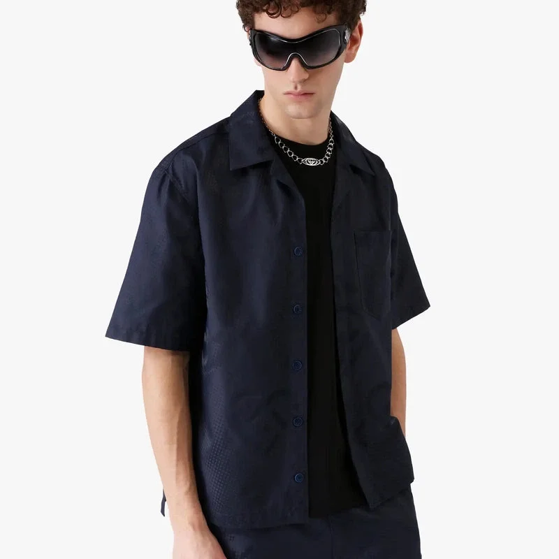Das marineblaue Kurzarmhemd mit Halbton-Monogramm besticht durch ein raffiniertes Design, das das Monogramm des Hauses zeigt, welches die Markenzeichen aller Saisons vereint – vom klassischen Diamanten über das Herz bis hin zum CC-Smile. Der Halbton-Effekt sorgt für eine strukturierte Mischung, die einen sanften Schimmer simuliert und dem Hemd Tiefe verleiht. Abgerundet wird das Design durch einen Kragen im kubanischen Stil, einen Knopfverschluss, Corozo-Knöpfe mit ineinander verschlungenem CC-Logo und eine Brusttasche.