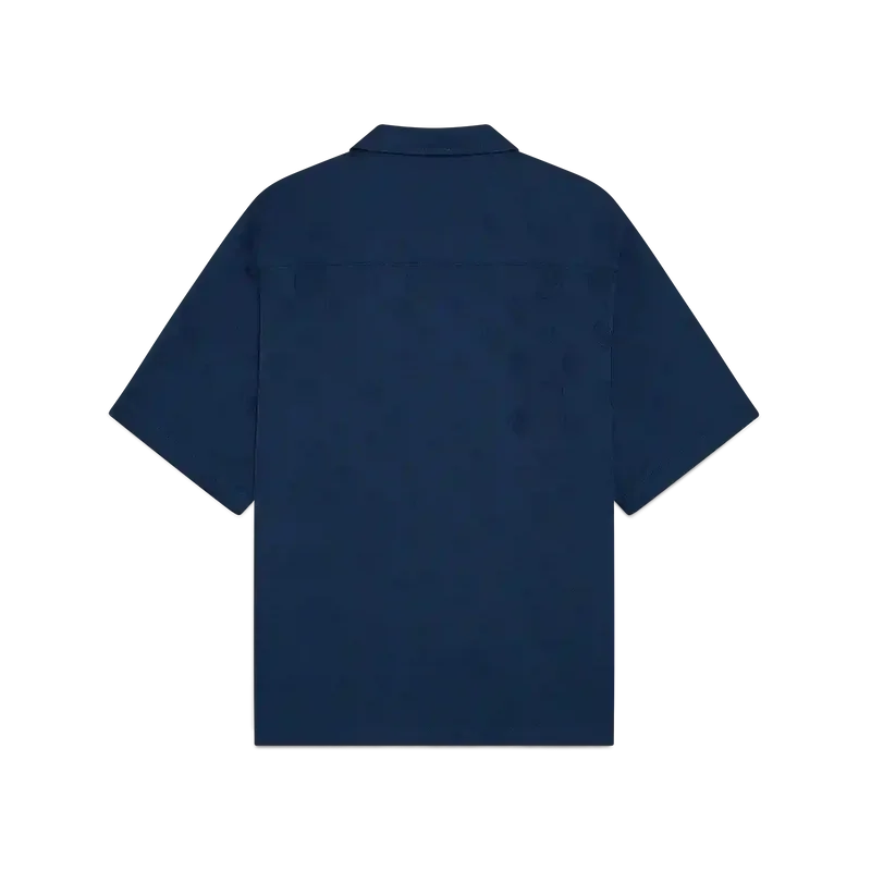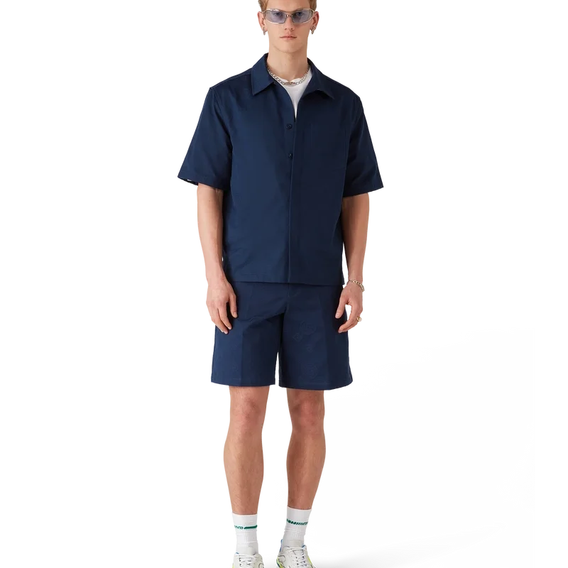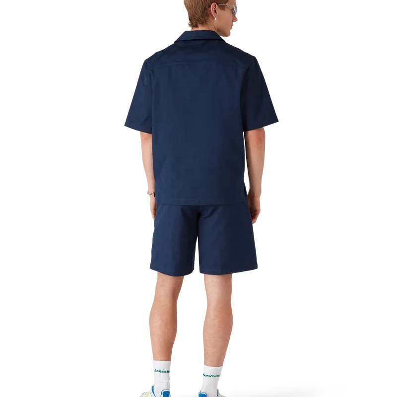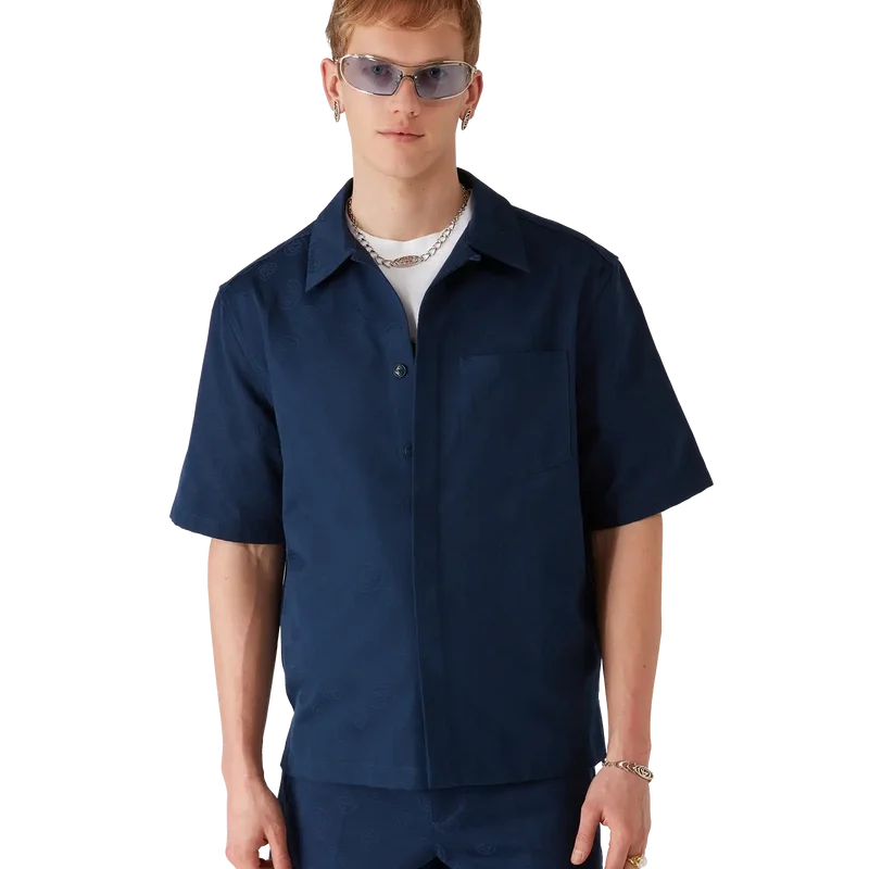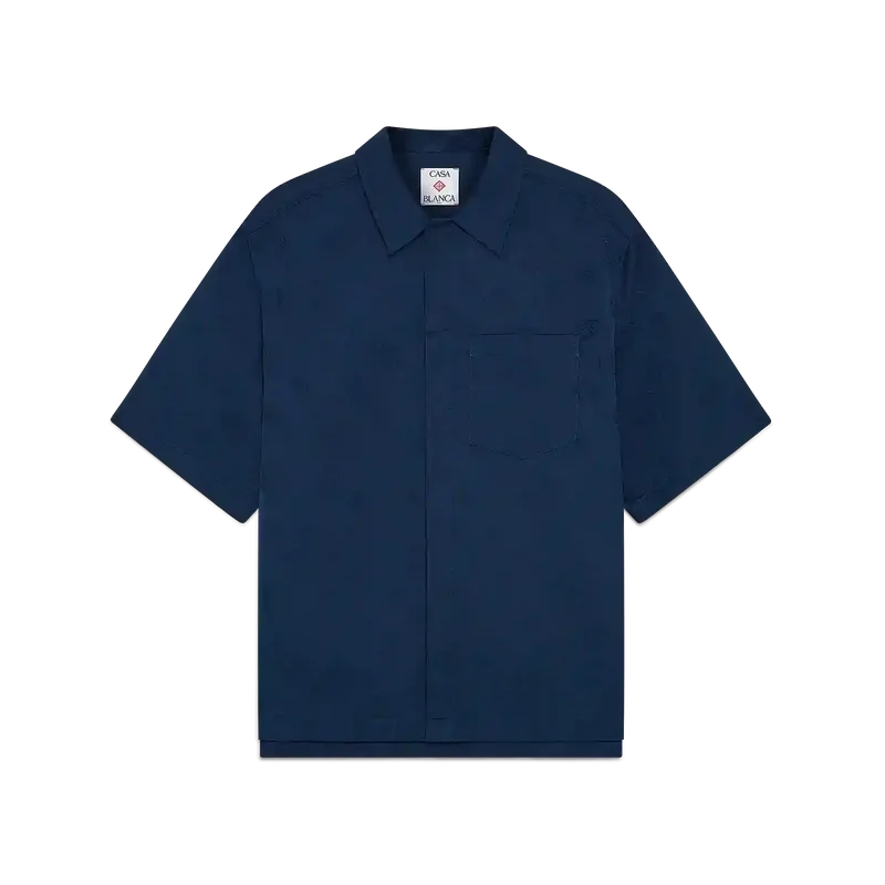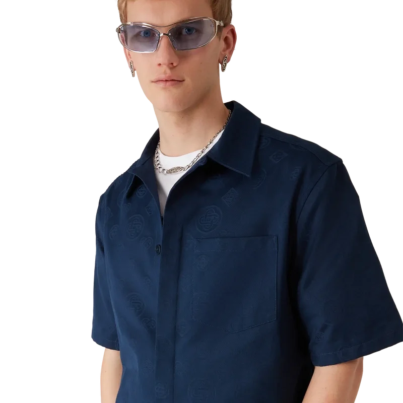 Das marineblaue Monogramm-Kurzarmhemd besticht durch ein raffiniertes Design mit dem ikonischen Monogramm-Muster des Hauses. Mit Spitzkragen, aufgesetzter Brusttasche, Knopfleiste, Corozo-Knöpfen mit ineinander verschlungenem CC-Logo und einem High-Low-Saum.
