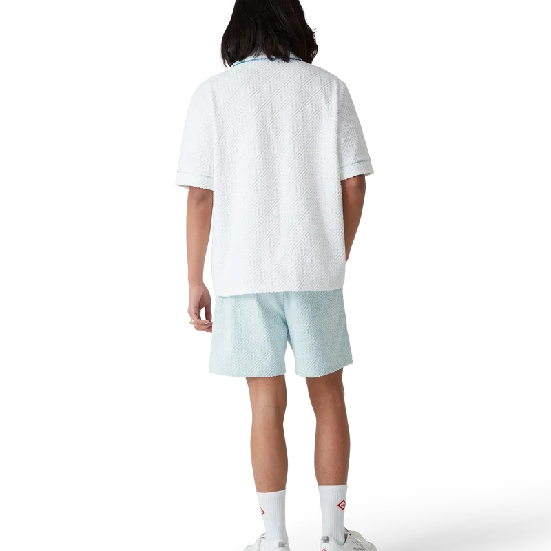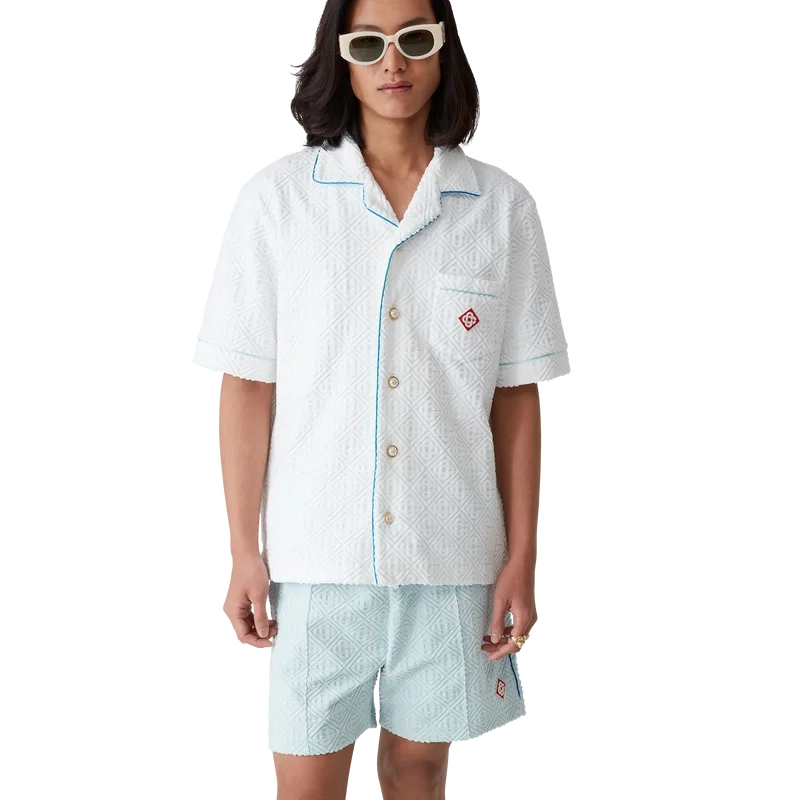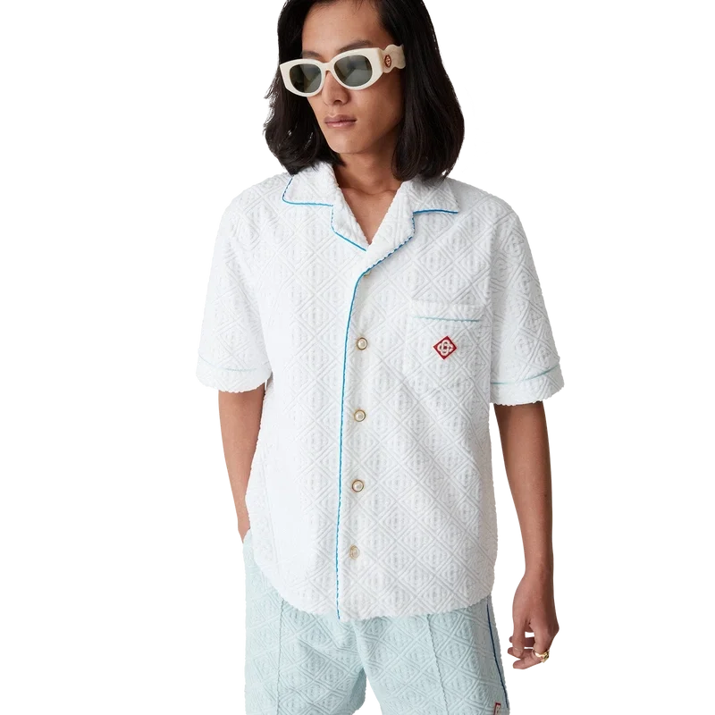 Das Monogram-Frotteehemd ist ein kurzärmeliges Modell aus einem Monogram-Frotteestoff aus Baumwollmischung und ziert das charakteristische Rautenlogo des Hauses. Abgerundet wird es durch eine Brusttasche, Kontrastpaspeln, goldgeränderte Perlmuttknöpfe und einen Kubanerkragen.