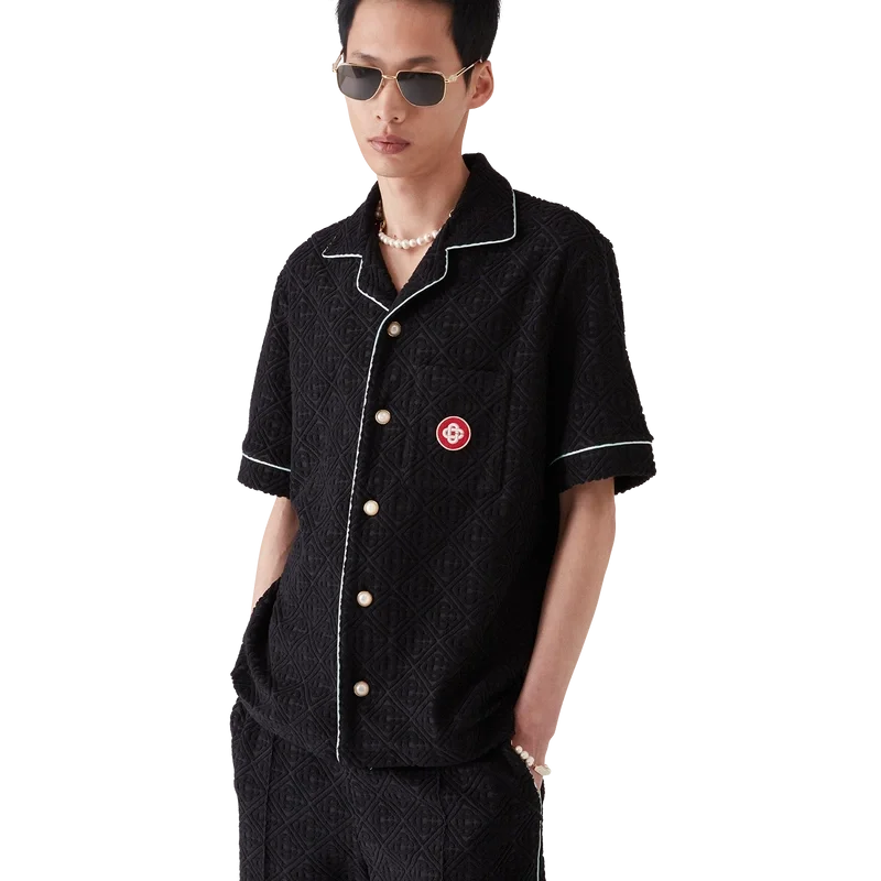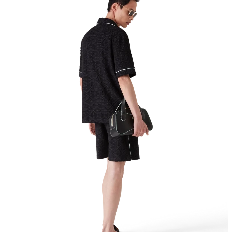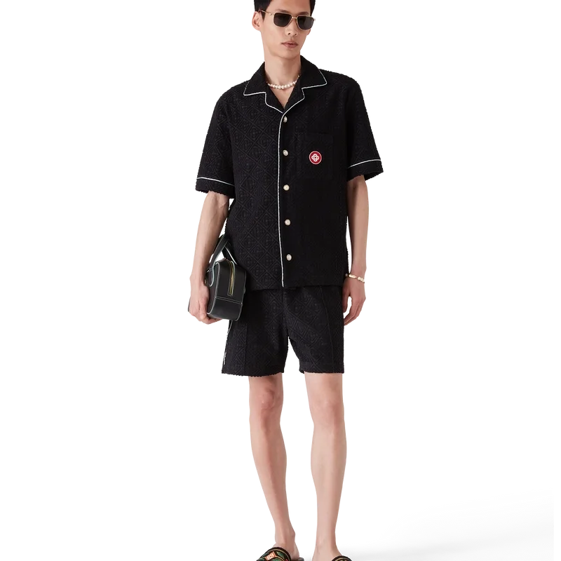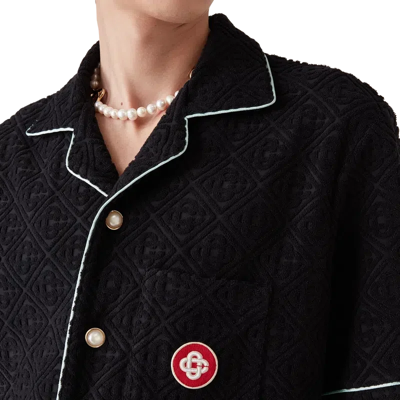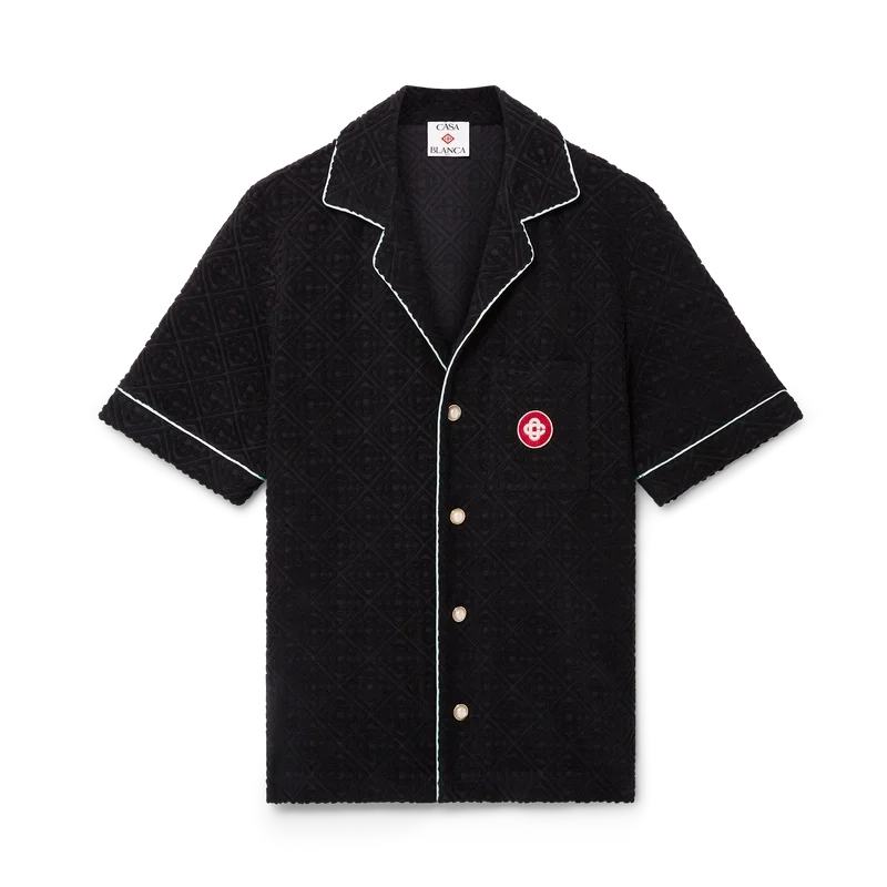 Das Monogram-Frottee-Shorts-Hemd mit kurzen Ärmeln ist ein klassisches Design aus einem Frottee-Stoff mit Monogramm. Es verfügt über einen Knopfverschluss, charakteristische goldgeränderte Perlmuttknöpfe, eine Brusttasche sowie Paspeldetails an Kragen, Knopfleiste, Manschetten und Brusttasche.