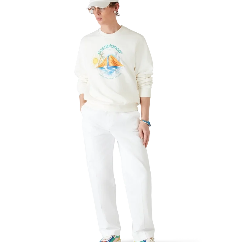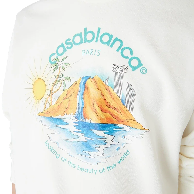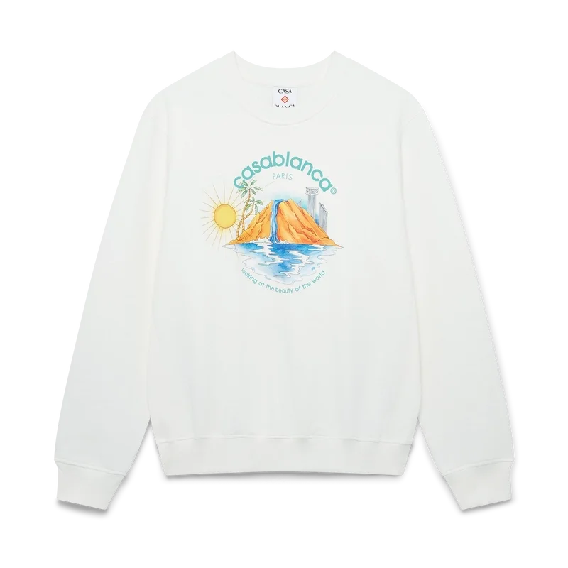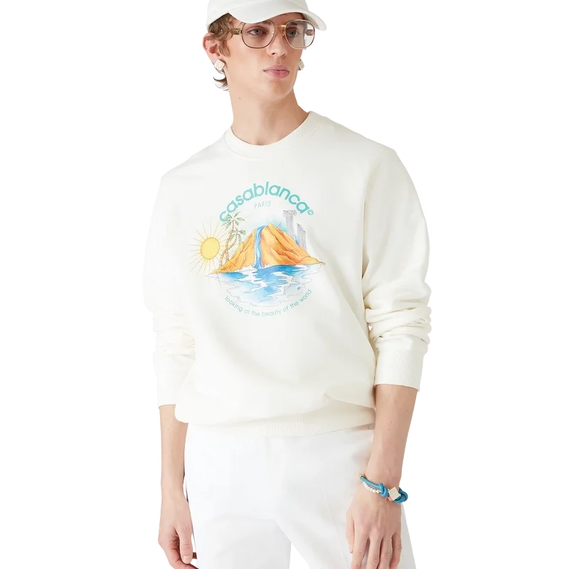 Das Oasis Sweatshirt ist ein bedrucktes Langarm-Modell aus Bio-Baumwollstoff, das mit dem saisonalen Artwork des Hauses mit Designelementen aus Natur, Architektur und Tennis verziert ist.