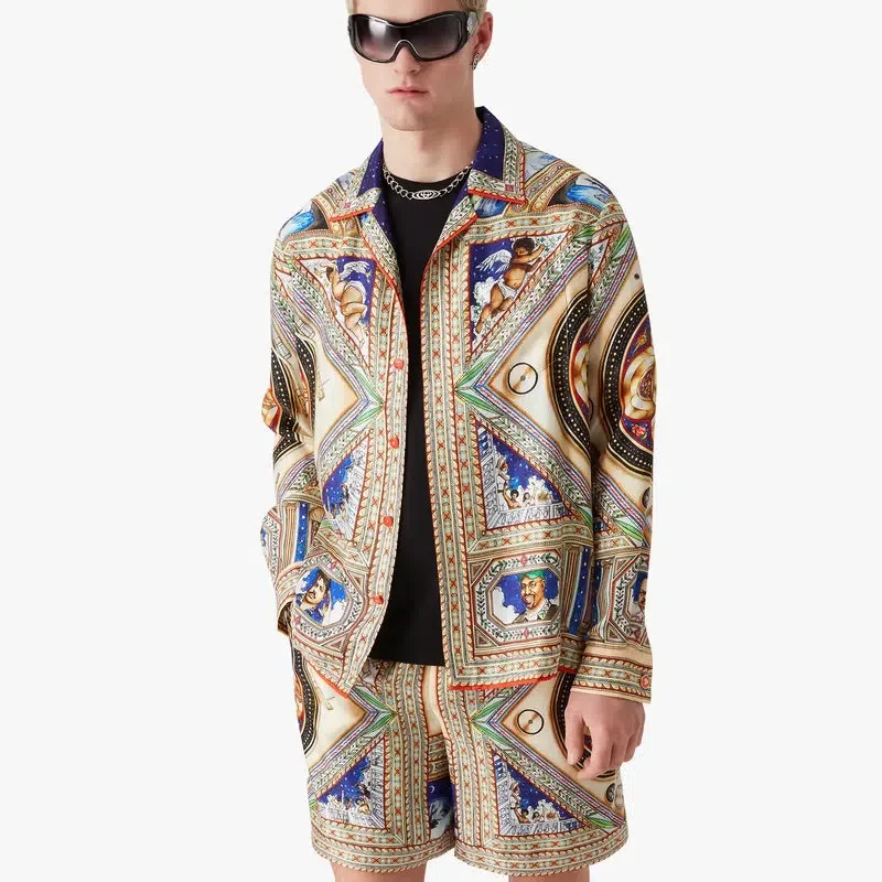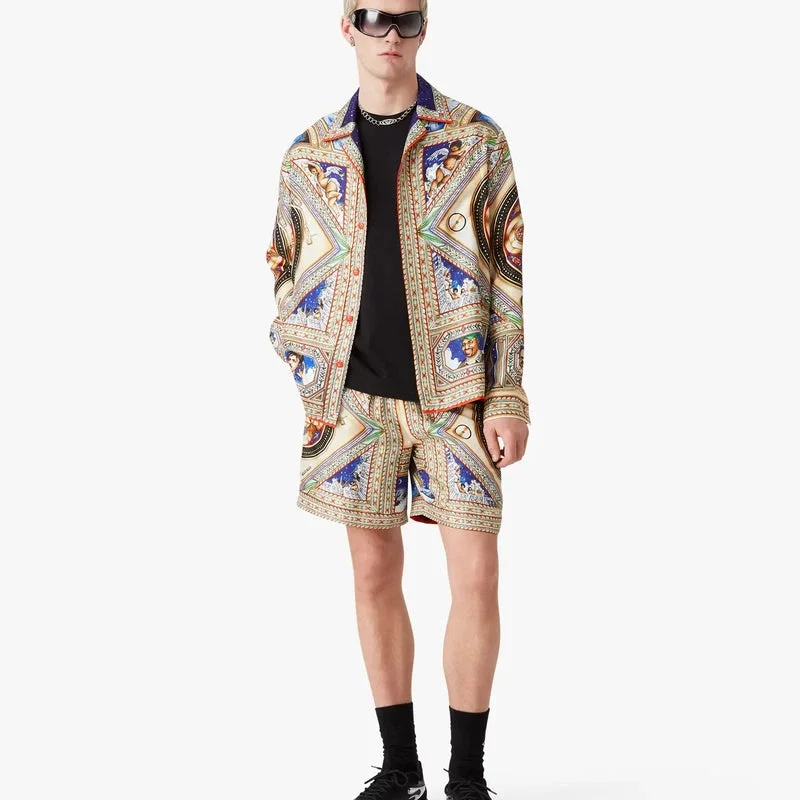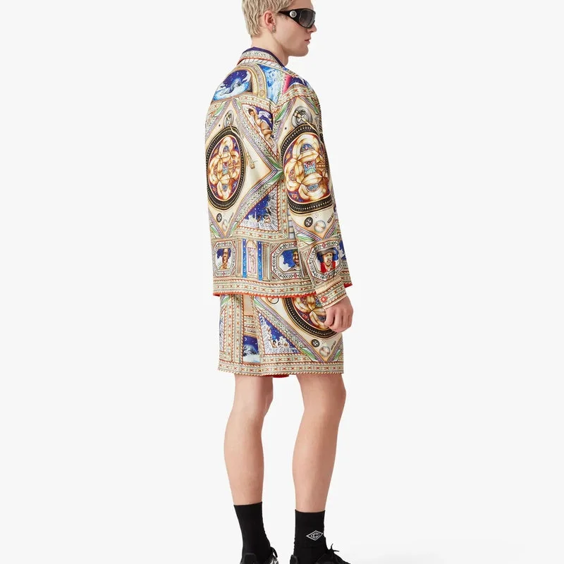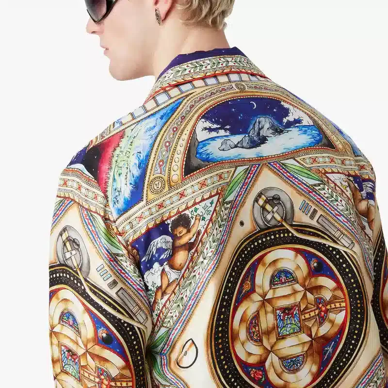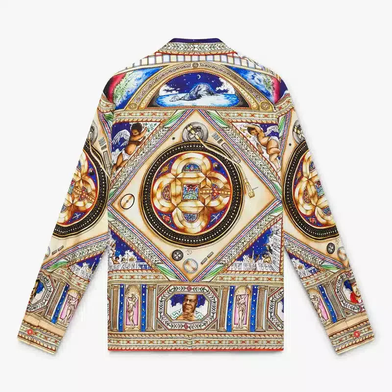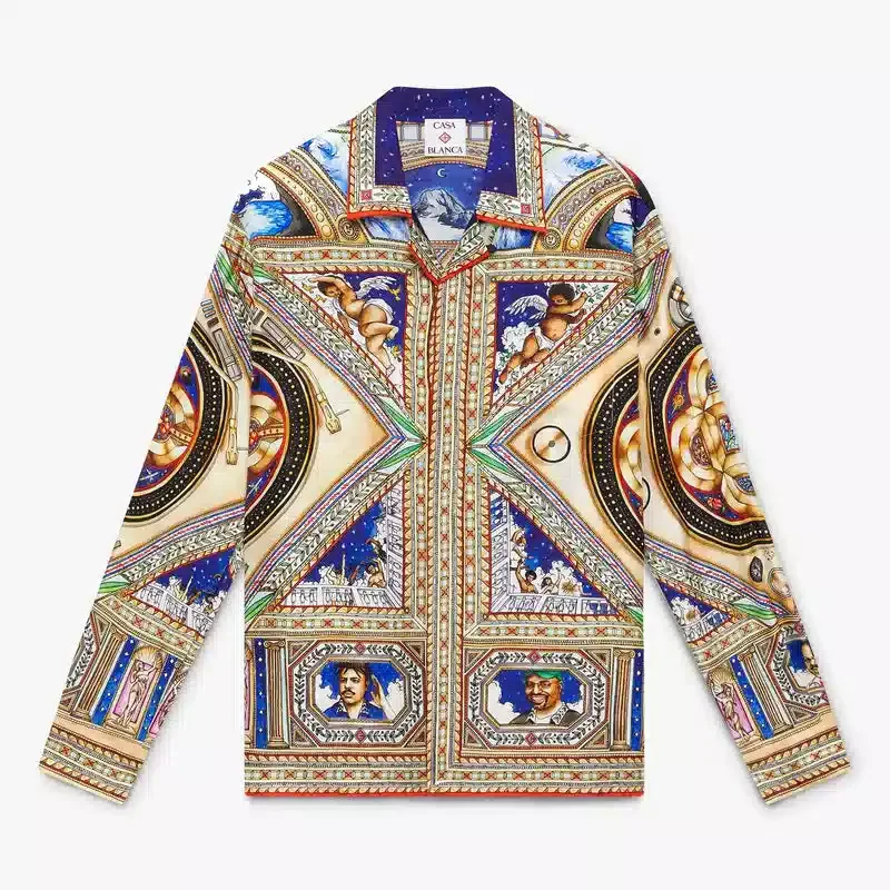 Das langärmelige Seidenhemd „Plafond Orne De Musique“ ist ein durchgehend bedrucktes Design mit Motiven, die von den kunstvollen und detailreichen bemalten Decken der Renaissance inspiriert sind und die zeitlosen Themen Musik und Tanz darstellen. Abgerundet wird es durch einen Kragen im kubanischen Stil, einen Knopfverschluss, Corozo-Knöpfe mit ineinander verschlungenem Cc-Logo, eine Brusttasche sowie die für das Haus typischen emaillierten Knöpfe mit Goldrand an den Manschetten, am Kragen, an der Knopfleiste und am Saum.