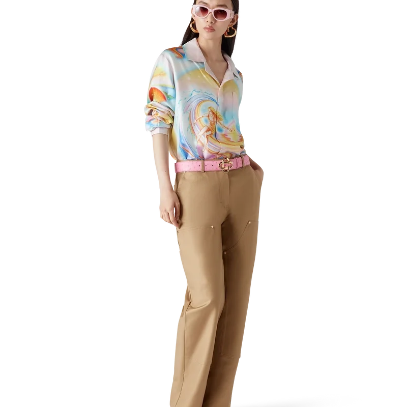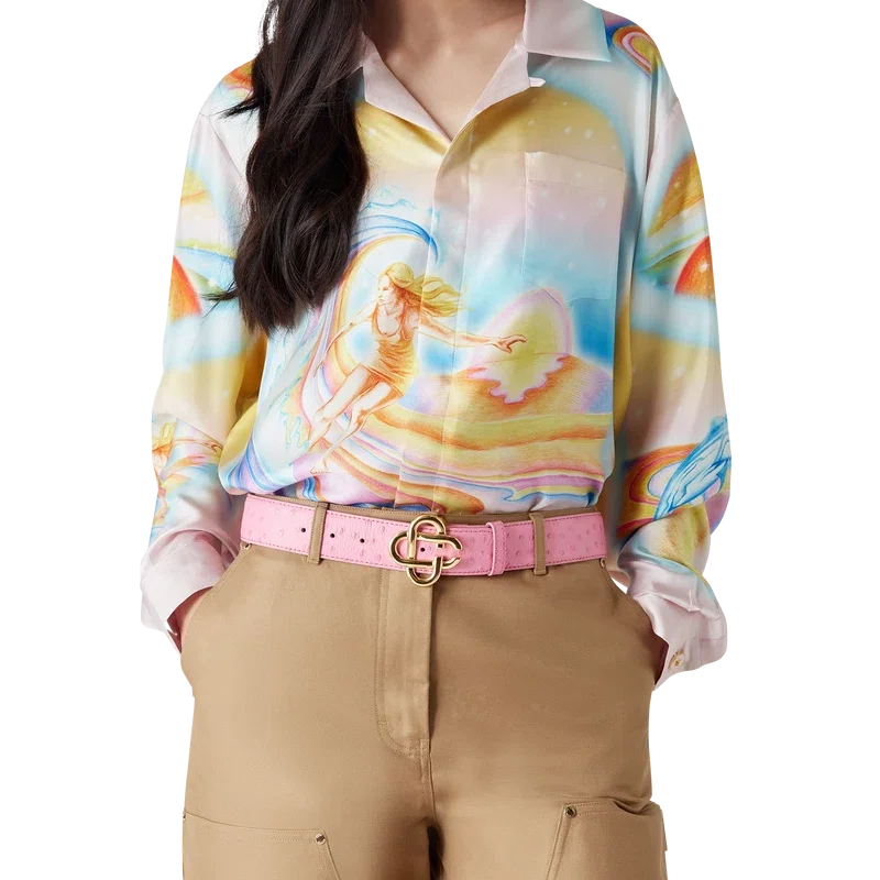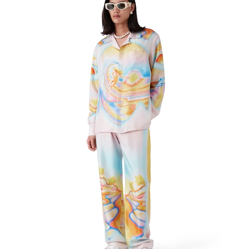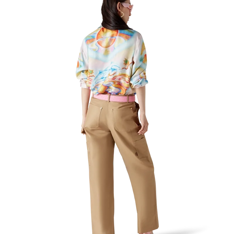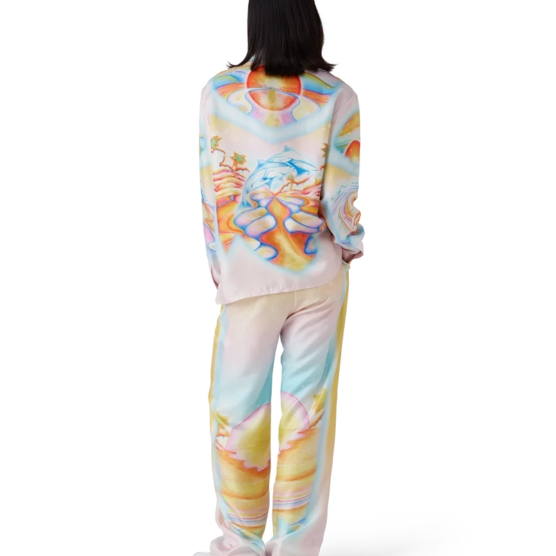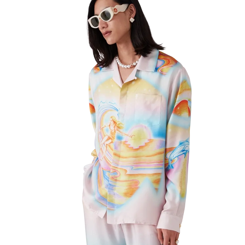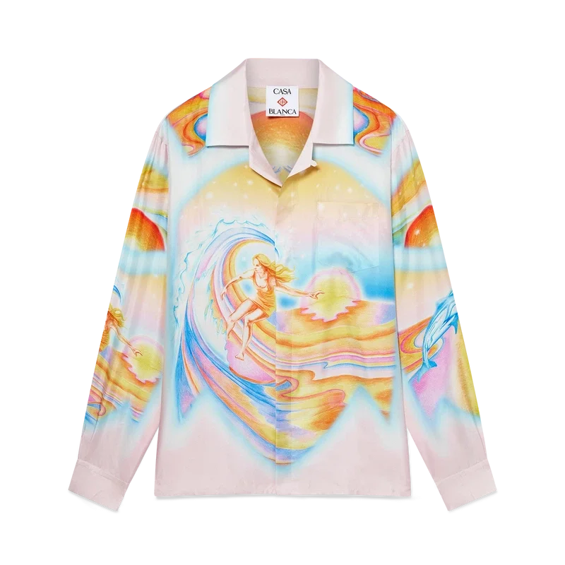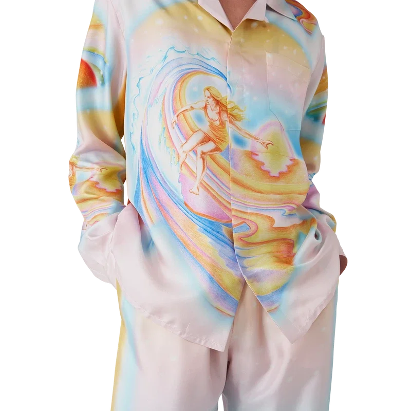 Das Psychedelic Nirvana Seidenhemd ist ein durchgehend bedrucktes Design aus Seidentwill mit einem Muster, das von den Airbrush-Surfboards der 70er Jahre in Kalifornien inspiriert ist. Die Pastellfarben verleihen dem Druck ein fast traumhaftes, idealistisches Gefühl. Verarbeitet mit einem Kubanerkragen, einer Brusttasche, einem verdeckten Knopfverschluss mit ineinandergreifenden Cc-Corozo-Knöpfen und einem goldrandigen Emaille-Knopf an jedem Ärmelbund.