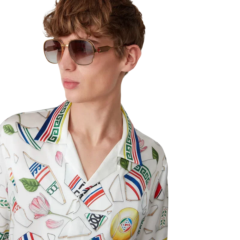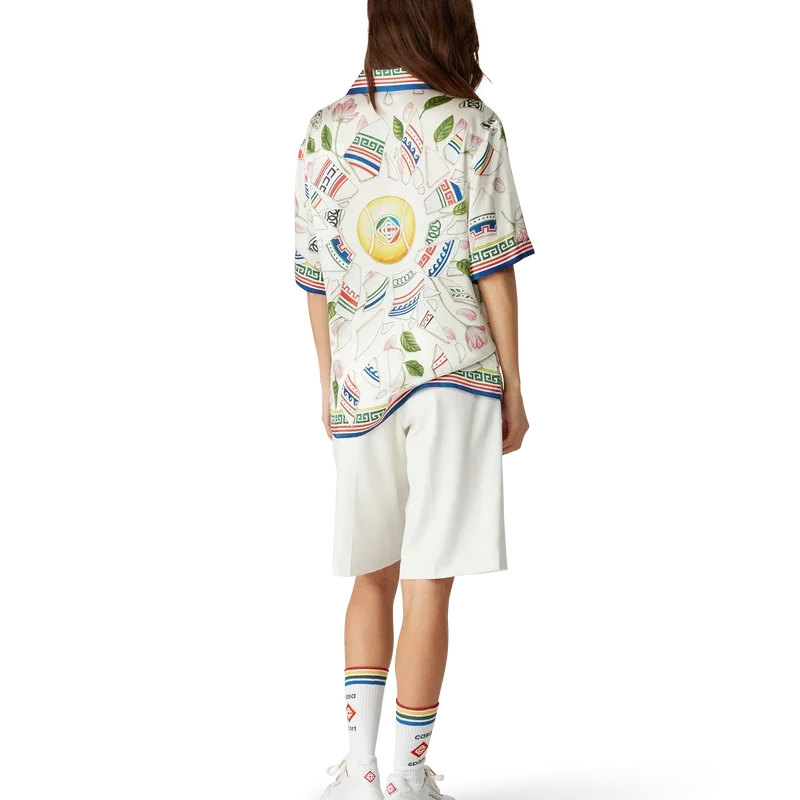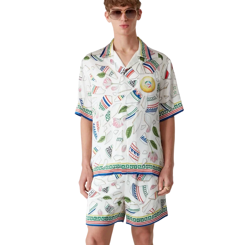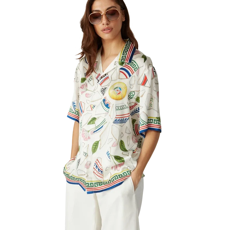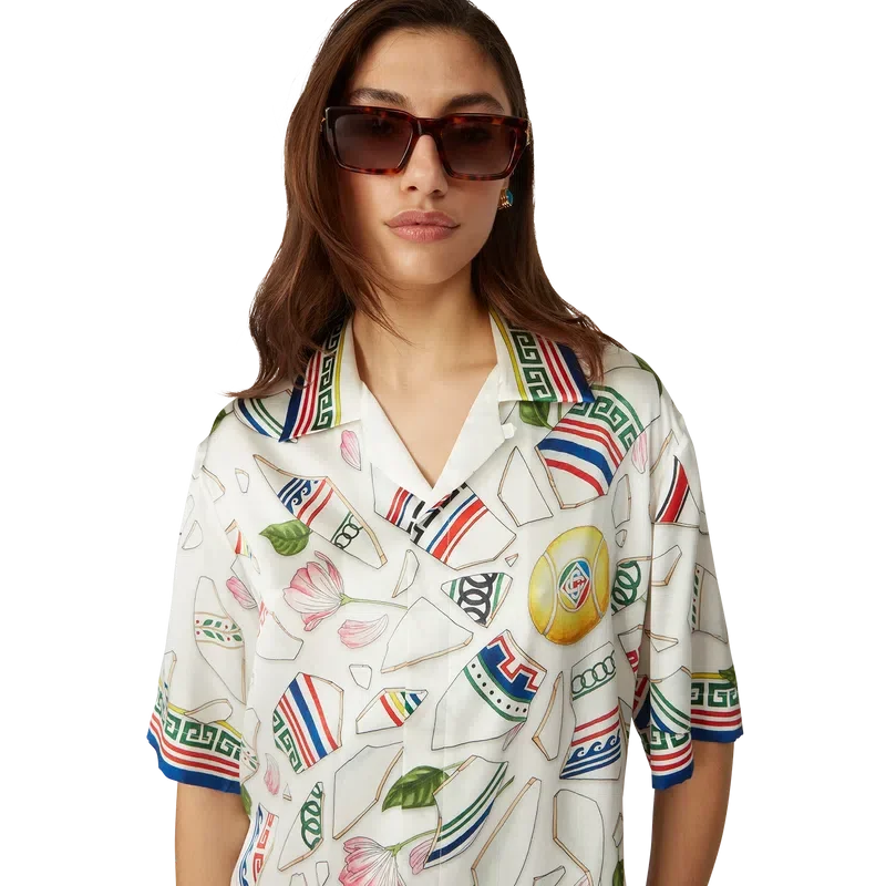 Das Seidenhemd „Le Vase Brise“ ist ein kurzärmeliges Modell mit durchgehendem Druck, gefertigt aus Seidensatin mit dem saisonalen Print des Hauses, inspiriert von der fortwährenden Auseinandersetzung mit der klassischen Schönheit und zeitgenössischen Anziehungskraft des antiken Griechenlands. Abgerundet durch charakteristische Corozo-Knöpfe mit dem ineinander verschlungenen CC-Logo, Knopfleiste, einen kubanischen Kragen und von griechischen Mustern inspirierte Details an Manschetten, Kragen und Saum.