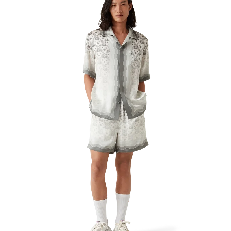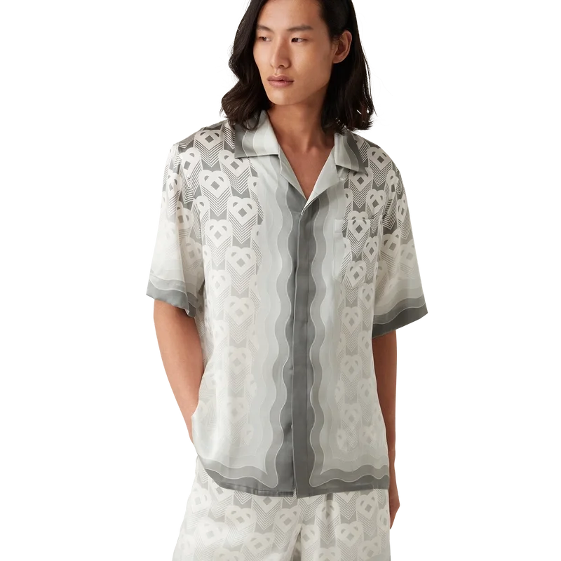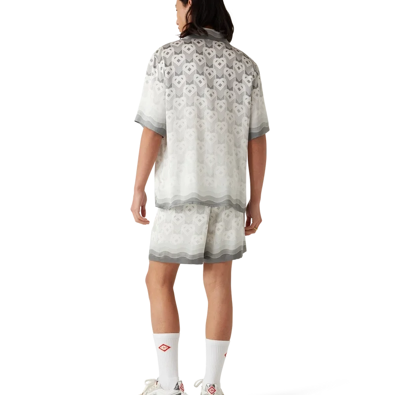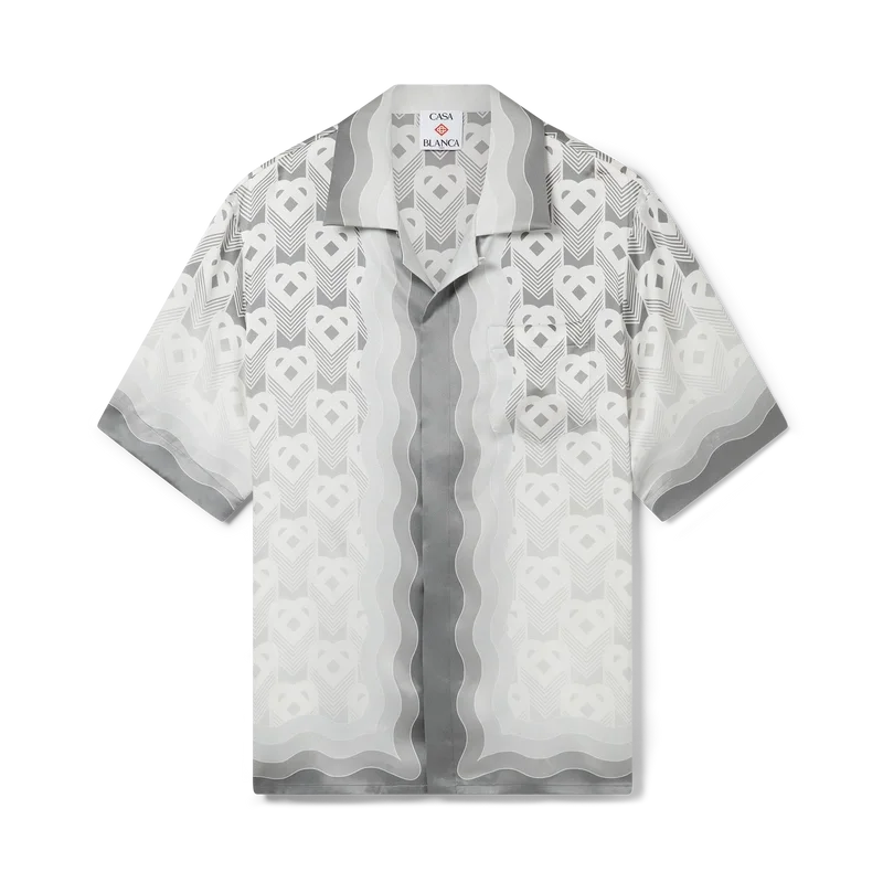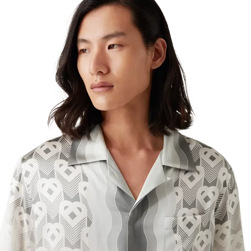 Das Seidenhemd mit Herz-Monogramm im Farbverlauf ist ein durchgehend bedrucktes Design, das das Herz-Monogramm des Hauses auf dem silbernen Farbverlaufshintergrund dieser Saison zeigt. Es ist aus einem Monogramm-Seidensatin gefertigt und mit einem Kragen, einer Brusttasche sowie Kragen, Manschetten, Saum und Knopfleiste mit Details im Memphis-Wellen-Stil im Farbverlauf versehen.