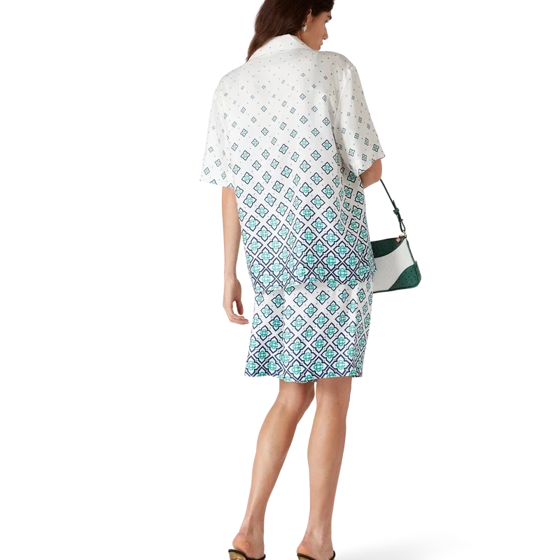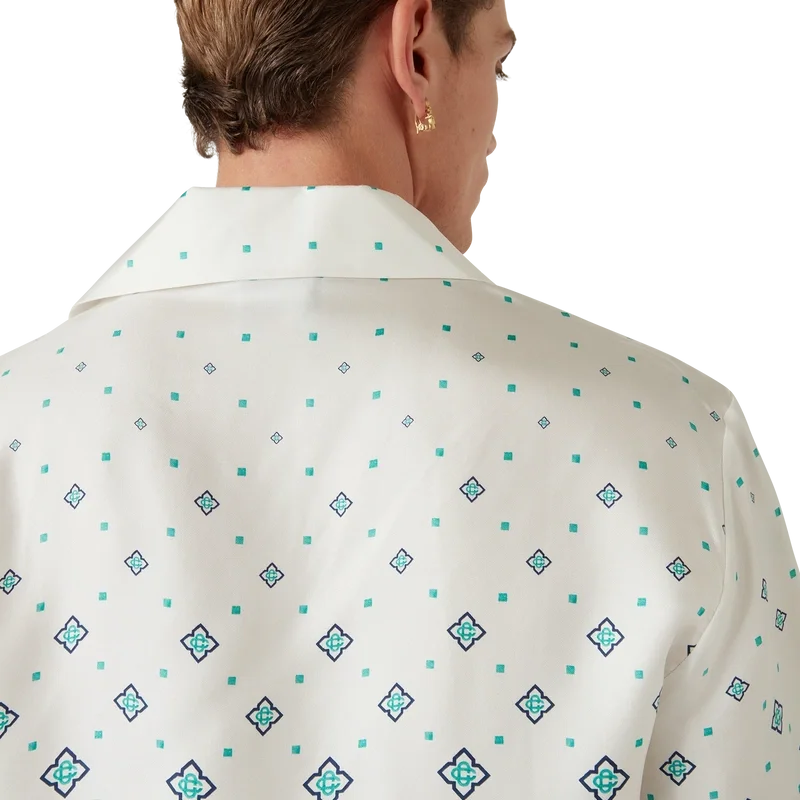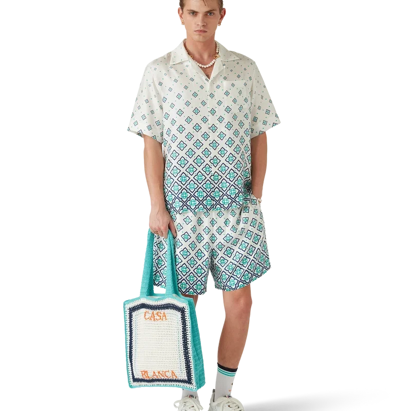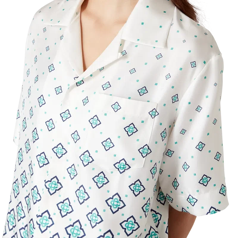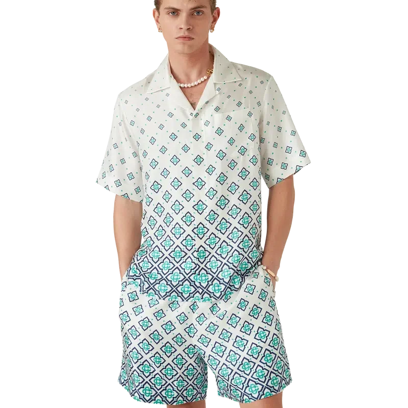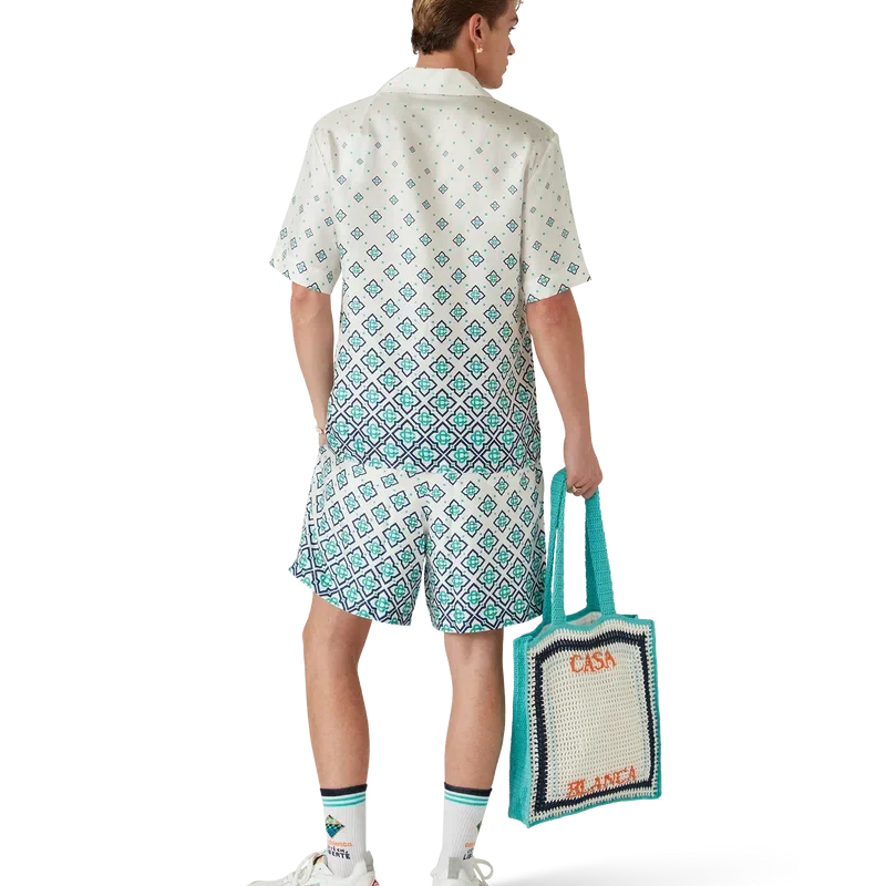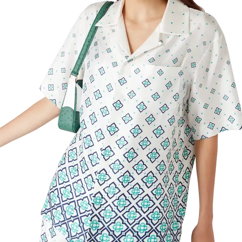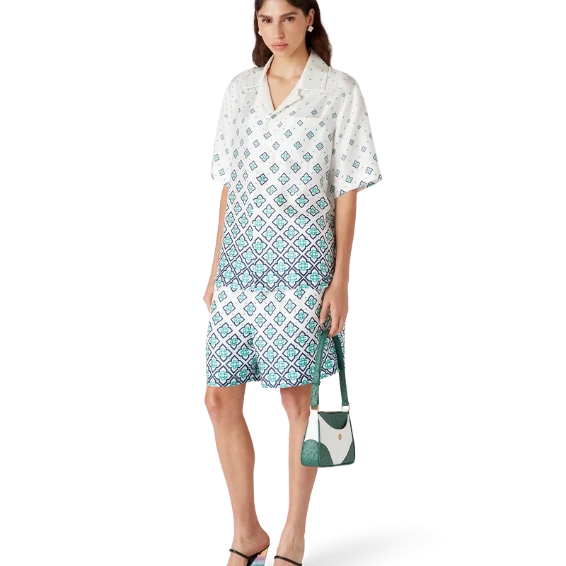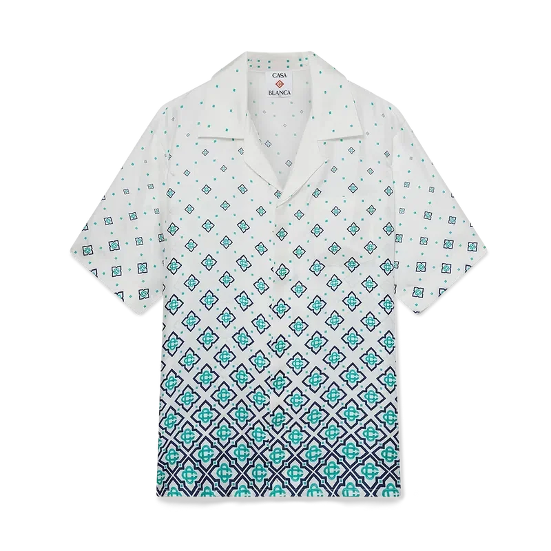 Das Seidenhemd mit Gradient-Monogramm ist ein bedrucktes Kurzarmmodell aus Seidentwill. Es verfügt über einen Kubanerkragen, einen verdeckten Knopfverschluss mit Corozo-Knöpfen mit ineinander verschlungenem Cc-Logo und eine Brusttasche.