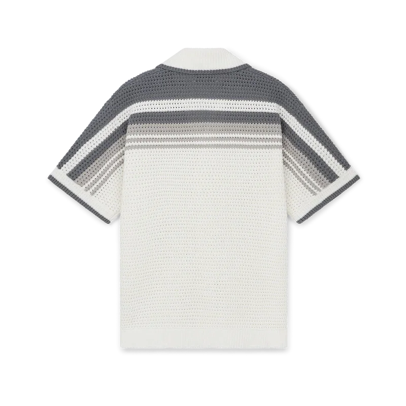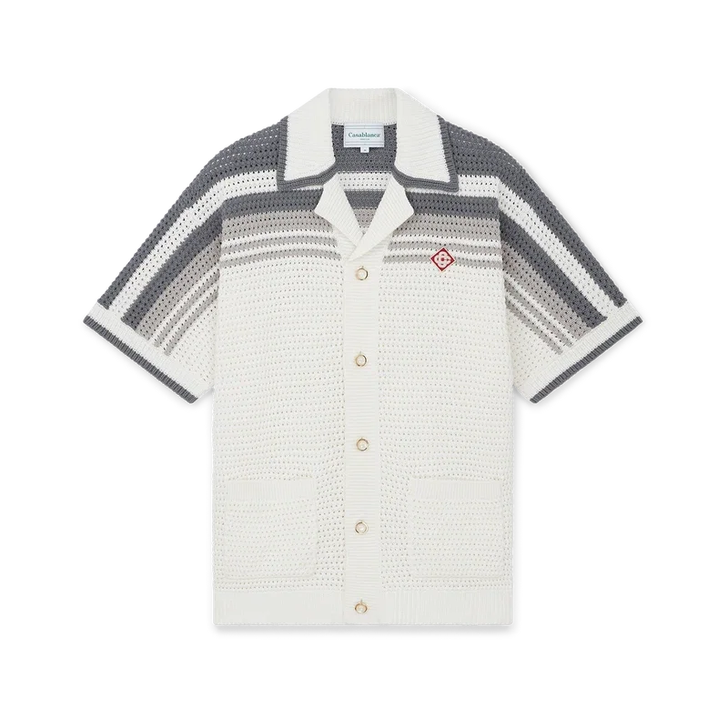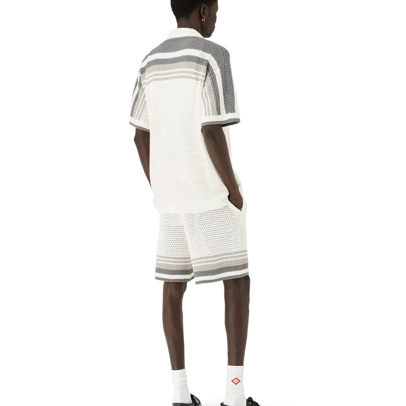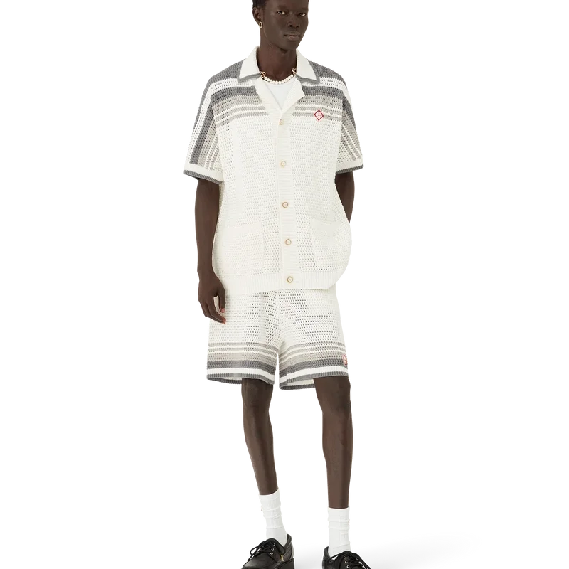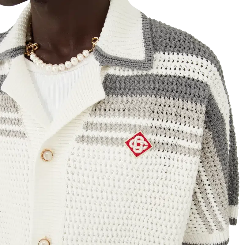 Das Tennis-Häkelhemd ist ein Strickmodell aus gehäkelter Baumwolle mit Streifenverzierungen an Schultern, Brust und Ärmeln. Mit geripptem Kragen, Ärmelbündchen und Saum mit Streifenverzierung, Knopfleiste vorne, aufgesetzten Taschen vorne und charakteristischen goldumrandeten Perlenknöpfen.