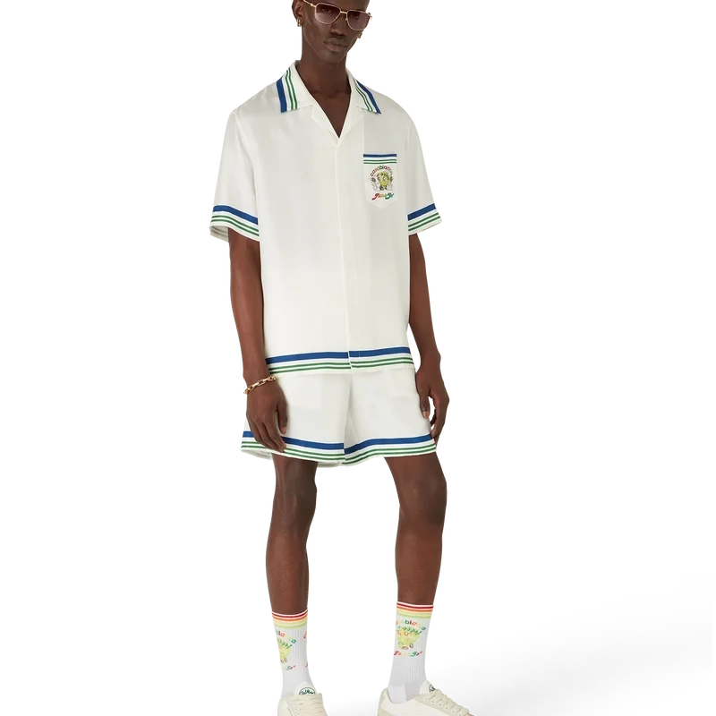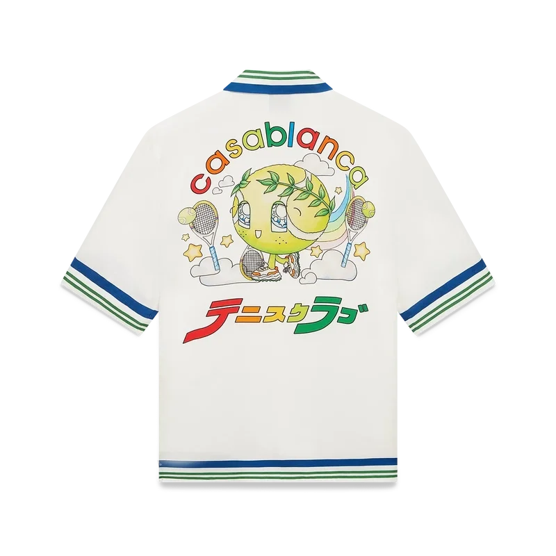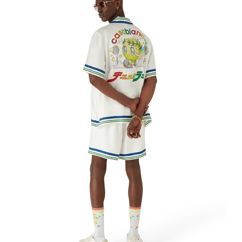 Das Tennis-Maskottchen-Shorts-Hemd aus Seidentwill ist ein bedrucktes Design mit saisonalen Motiven des Kawaii-Tennisballs – diese Figur ist ein zentraler Bestandteil unseres Universums. Es vereint Elemente wie das Lorbeerblatt, den Atlantis-Sneaker, den Schläger und die Kawaii-Augen. Wir haben uns dafür entschieden, diese Figur als zentrales Motiv für alle Herrenmodelle der Kollektion zu verwenden. Abgerundet wird das Design durch einen Kubanerkragen, einen Knopfverschluss, Corozo-Knöpfe mit dem ineinander verschlungenen Cc-Logo, eine Brusttasche sowie blau-weiß-grüne Streifen an Kragen, Manschetten, Saum und Tasche.