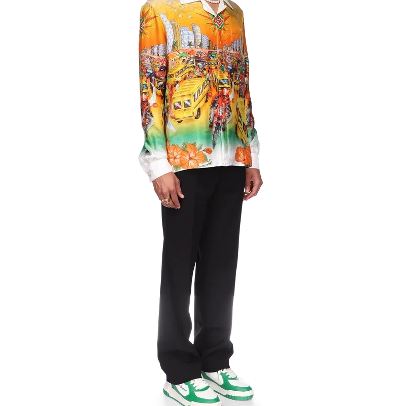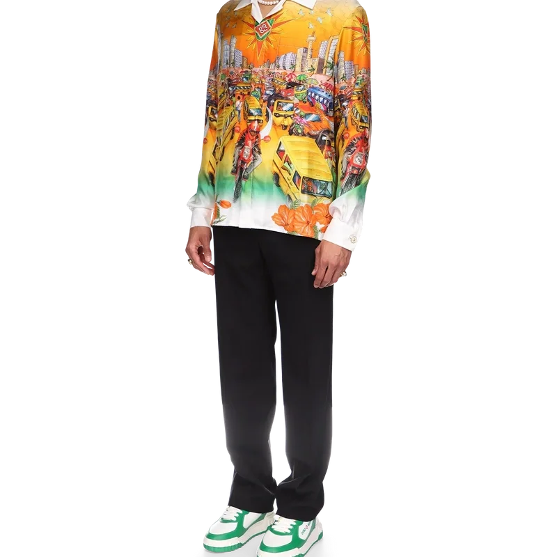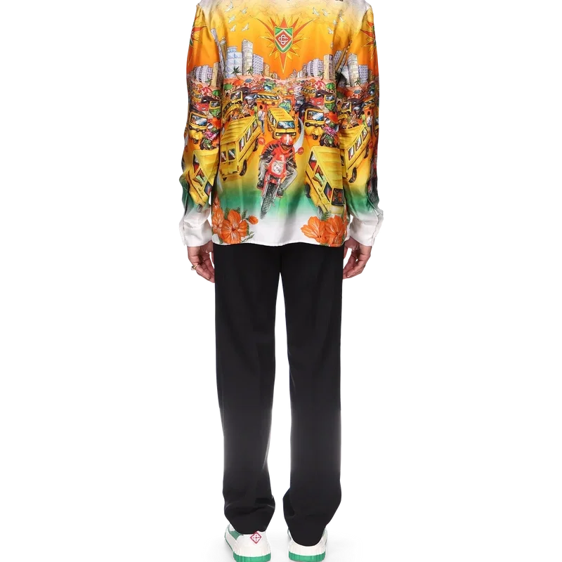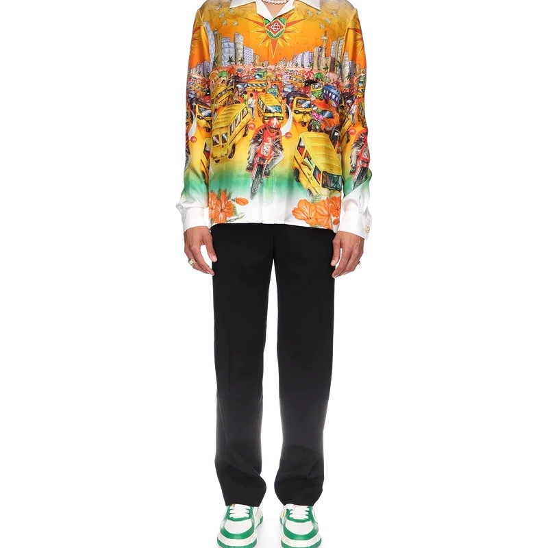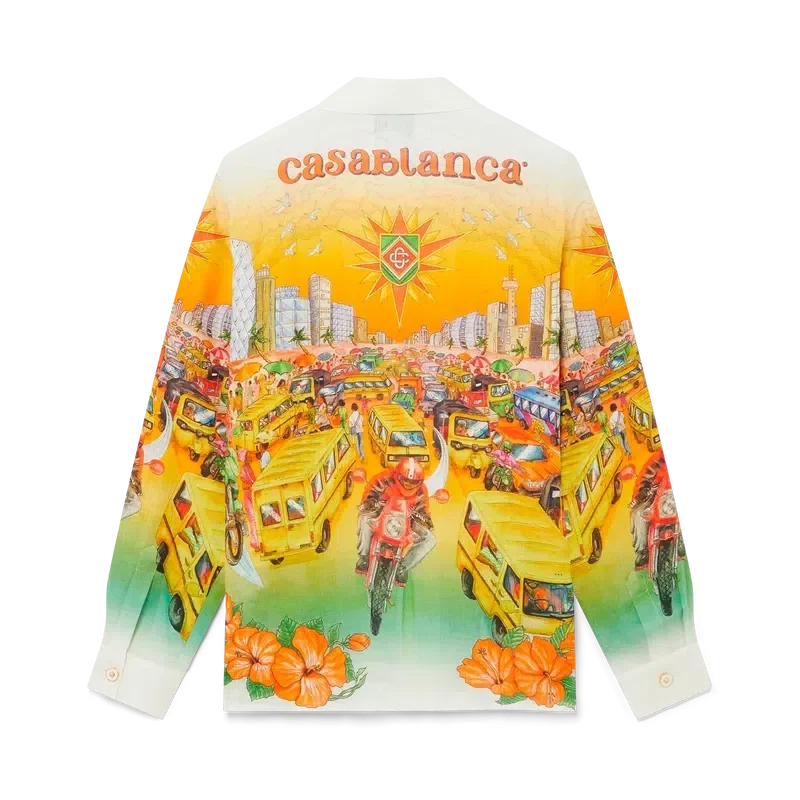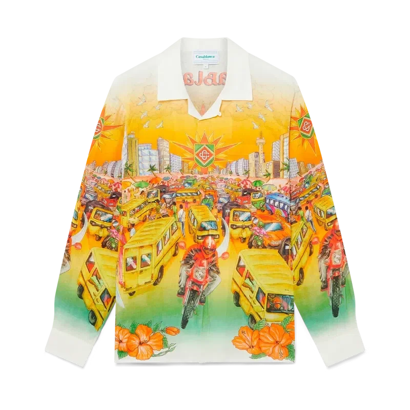 Das Traffic-Leinenhemd ist ein langärmeliges Modell mit Allover-Print, inspiriert von Nigeria, mit Motiven, die Hibiskusblüten, den Straßenverkehr und eine Stadtlandschaft vor dem Hintergrund der tiefen Farbtöne der Skyline von Lagos zeigen. Abgerundet durch kontrastfarbene Kragen- und Manschetten, Knopfleiste, eine Brusttasche und die charakteristischen emaillierten Knöpfe mit Goldrand.