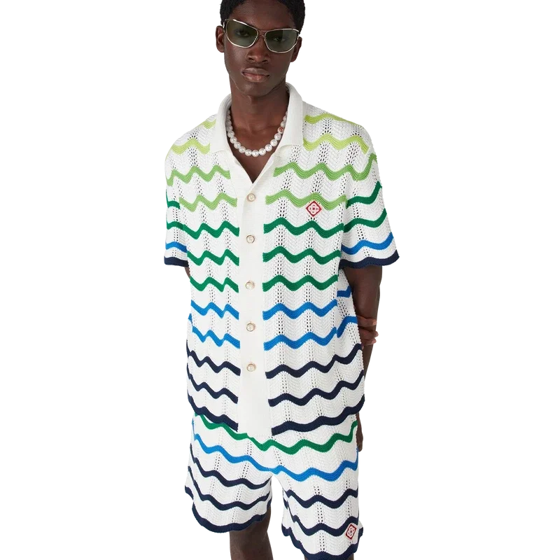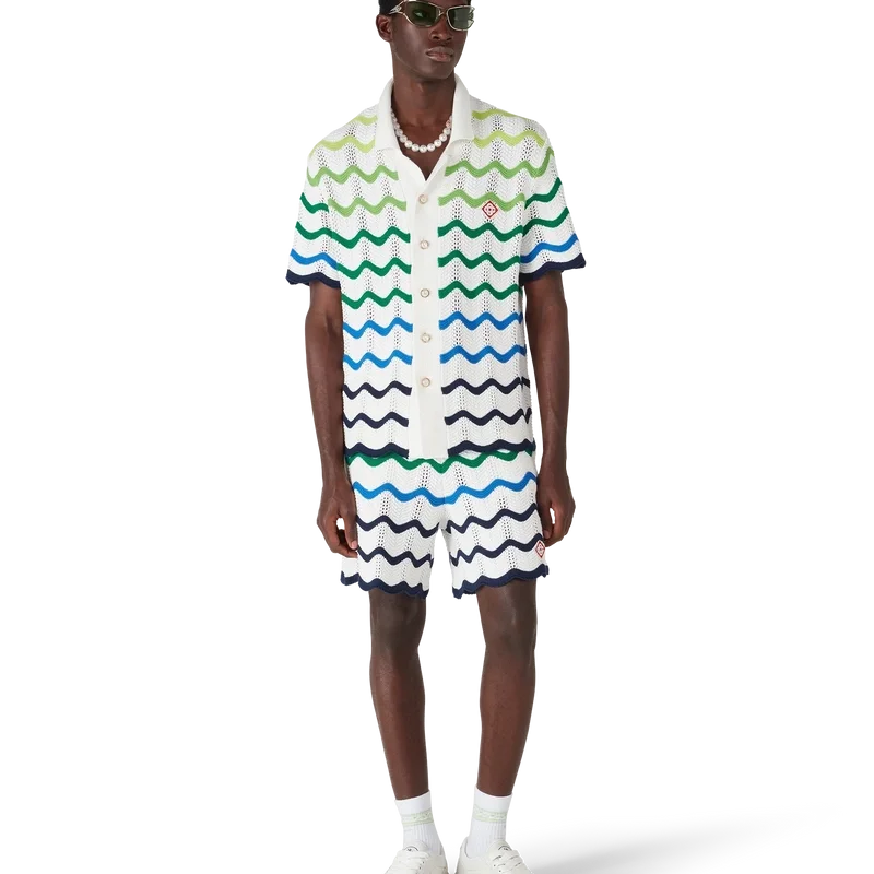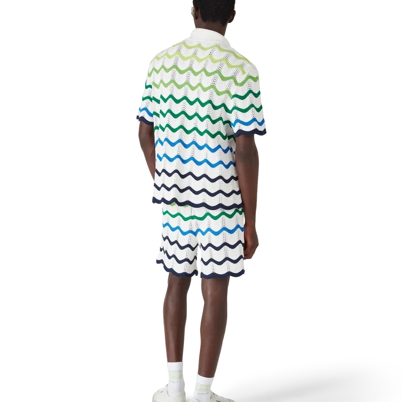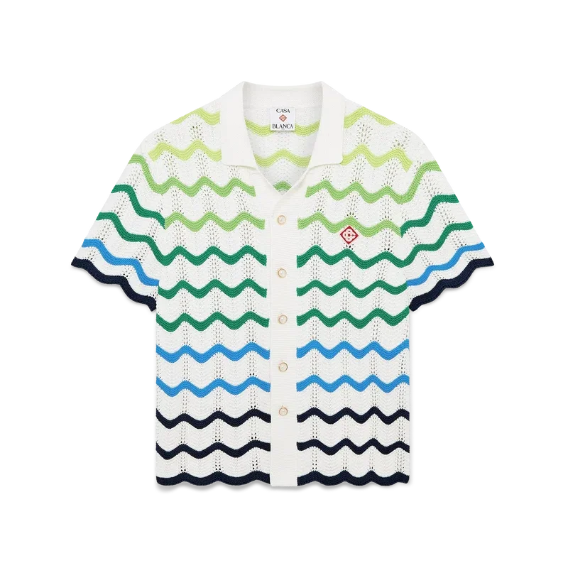 Das Wave-Strickhemd ist ein raffiniertes Design aus einem offen gewebten Häkelbaumwollstoff mit dem Strick-Farbverlauf der Saison. Abgerundet wird es durch einen Knopfverschluss, eine Silhouette mit kubanischem Kragen und kurzen Ärmeln, gerippte Säume sowie die für das Haus charakteristischen goldenen Perlenknöpfe und das Diamant-Logo.