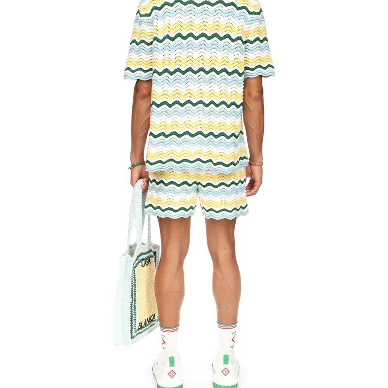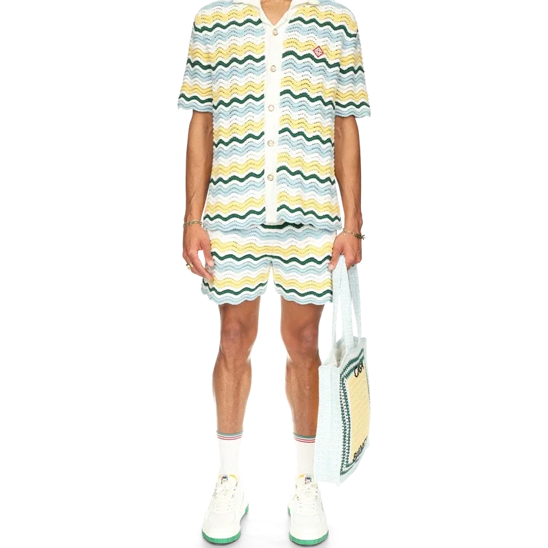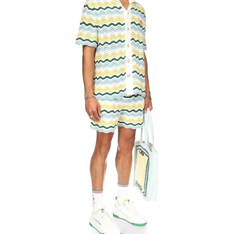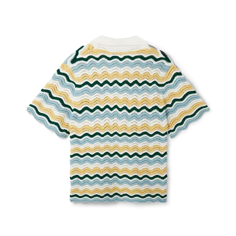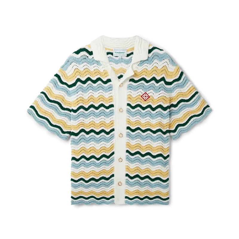 Das Wavy Boucle Hemd ist ein typisches Casablanca-Modell aus einem weichen, strukturierten, offen gewebten Häkelstoff. Mit unserem charakteristischen goldenen Perlenknopfverschluss, offenem Kragen, kurzen Ärmeln und dem Casablanca Paris-Markenlabel – entworfen, um zu klassischen Passformen getragen zu werden.