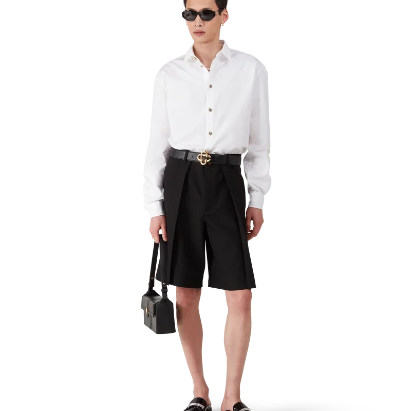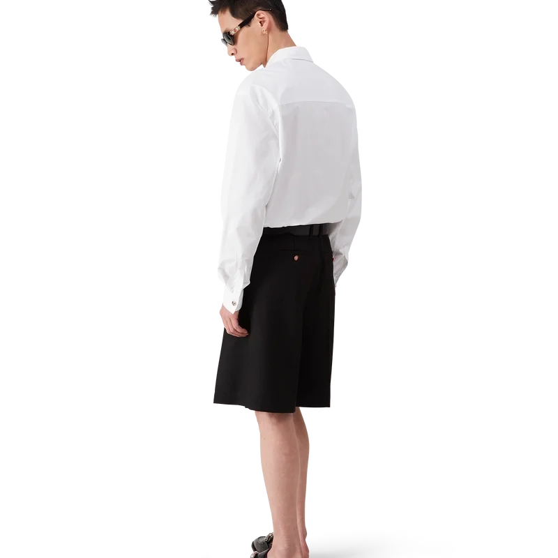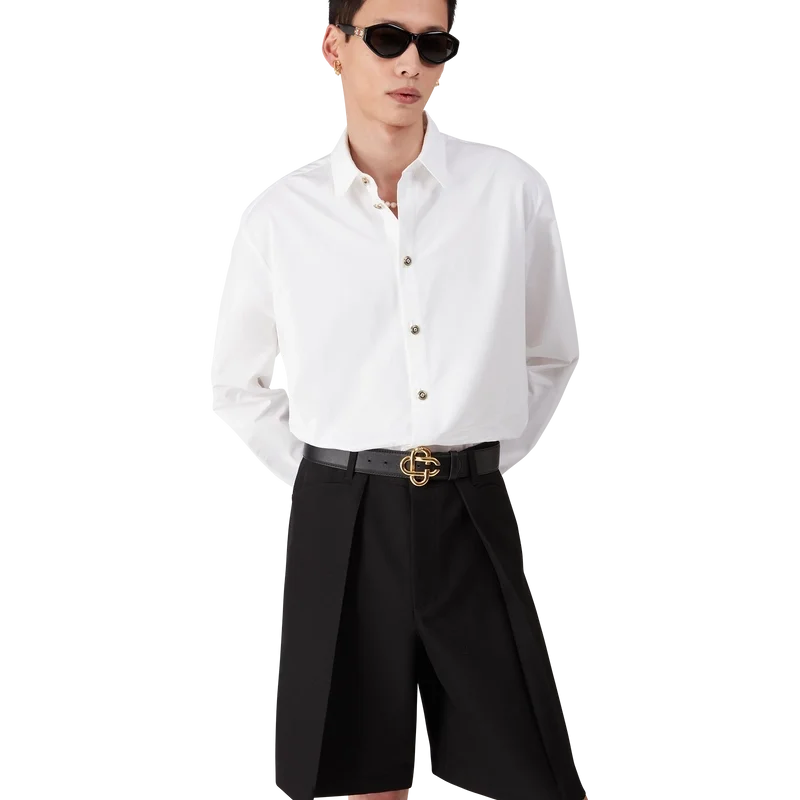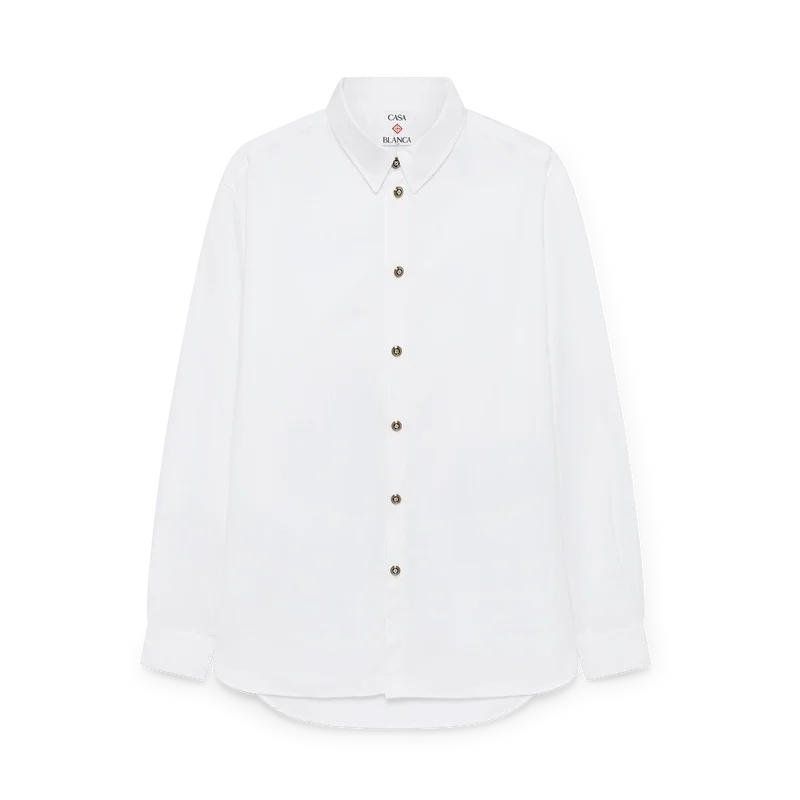 Das weiße Baumwollhemd ist ein langärmeliges Modell aus Baumwollhemdenstoff. Es verfügt über einen spitzen Kragen, einen Knopfverschluss, flache Emailleknöpfe und einen abgerundeten Saum.