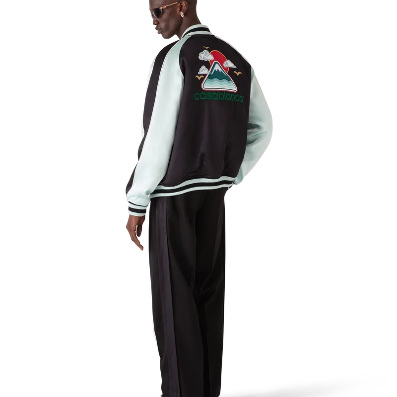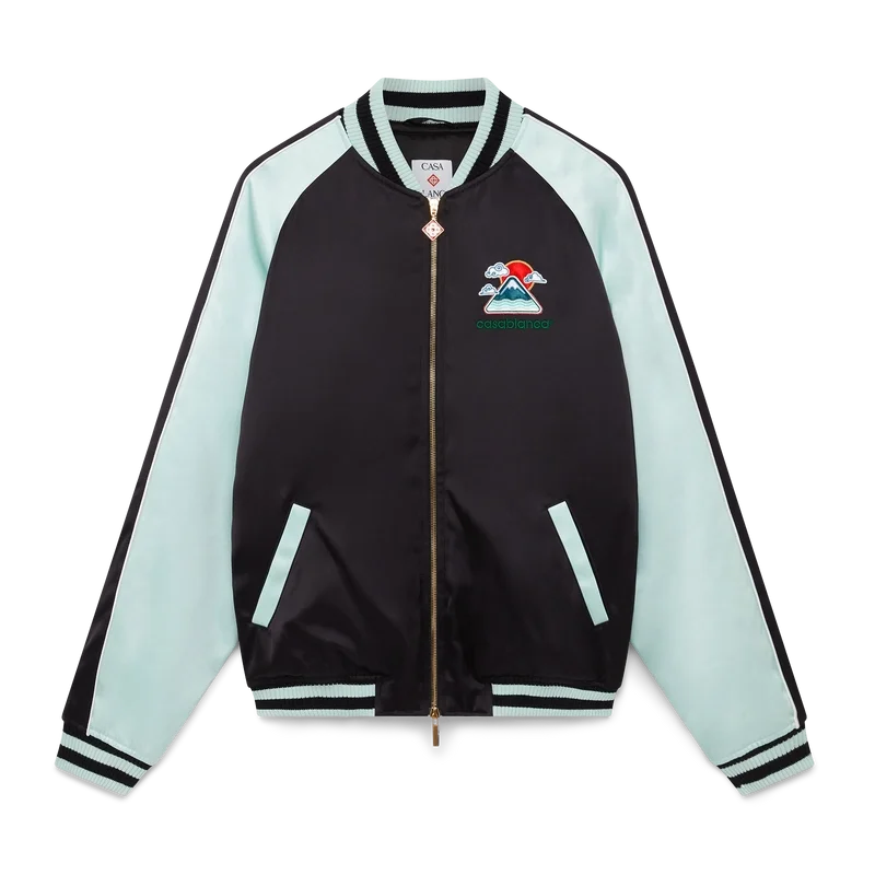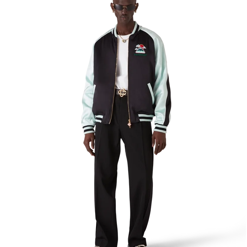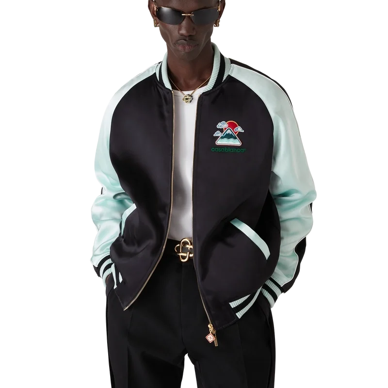 Die bestickte Satin-Bomberjacke ist eine traditionelle Jacke im Bomber-Stil, gefertigt aus Satin mit einem Motiv, das von Japans reichhaltiger Ikonografie inspiriert ist. Mit nur wenigen Linien und Farben vermittelt sie eine starke visuelle Botschaft und ist damit eines der Aushängeschilder der Kollektion. Ausgestattet mit einem Reißverschluss mit dem charakteristischen Diamant-Logo des Hauses, Raglanärmeln mit grünen und schwarzen Einsätzen und Paspeldetails, einem Futter, schrägen Leistentaschen sowie einem gerippten Stehkragen, Manschetten und Saum mit mint- und schwarzgestreiften Details.