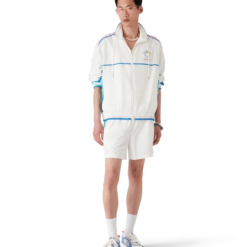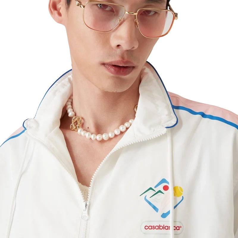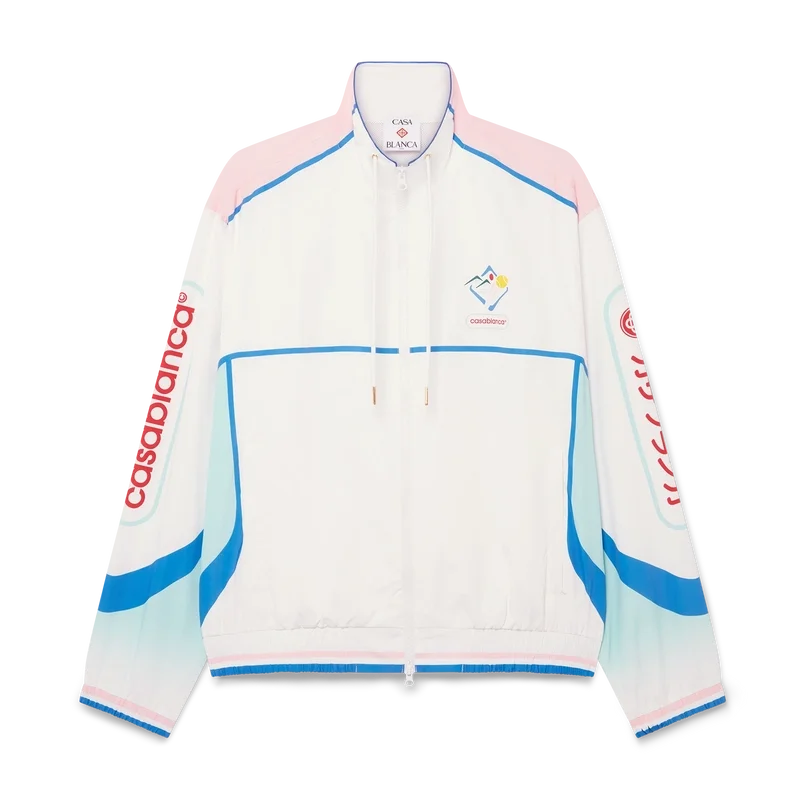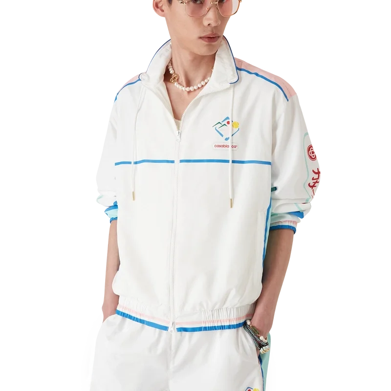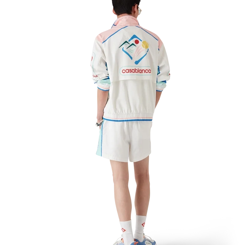 Die Casa Sportif Windbreaker-Jacke ist ein Sportbekleidungsmodell aus technischem Taftstoff, das mit den von Japan inspirierten Motiven der Saison verziert ist. Ausgestattet mit einem Frontreißverschluss, einem Trichterkragen, Fronttaschen sowie elastischen Bündchen und Saum.