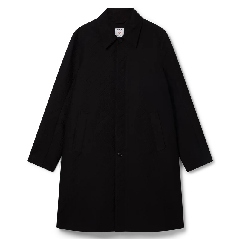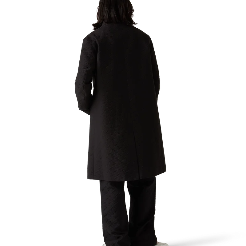 Der Jacquard-Car-Coat ist ein mittellanger Mantel aus einem Jacquard-Baumwollmischgewebe mit dem charakteristischen Diamond Monogram des Hauses. Er verfügt über einen Knopfverschluss vorne, vergoldete Druckknöpfe mit Markenlogo, ein Futter, einen Trichterkragen, vertikale Seitentaschen und einen Schlitz hinten.